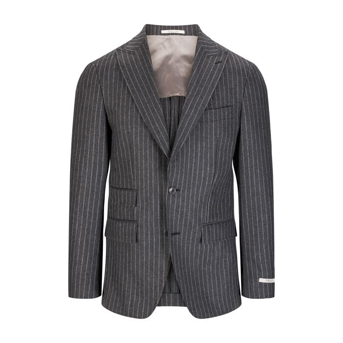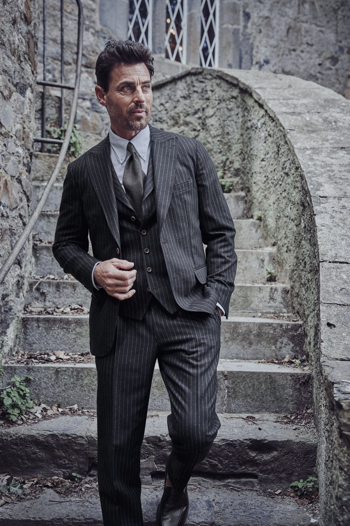 En elegant dress fra Frislid i ull, designet i en varm brun tone med klassiske, tynne striper. Jakken har spisse slag som gir et markant og stilfullt preg, mens buksen er utformet for en komfortabel og tidløs passform. Dressen kan kompletteres med en matchende vest for et fullt tredelt antrekk. En moderne tolkning av den klassiske stripete dressen – perfekt til både jobb og formelle anledninger.