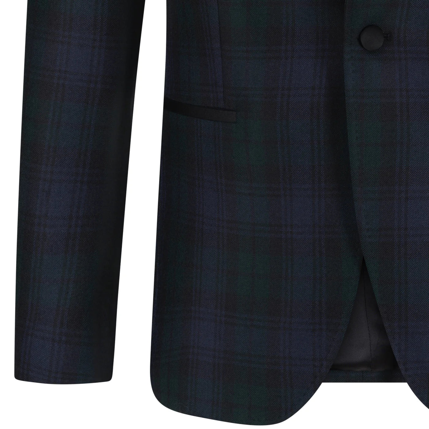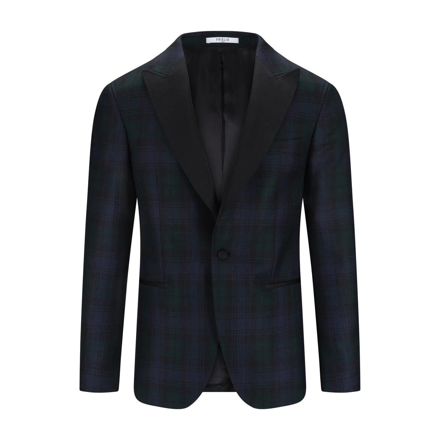 En elegant navy smokingjakke fra Frislid, laget i ull med blackwatch mønster som gir et eksklusivt uttrykk. Jakken har peak lapels og et klassisk snitt med rene linjer som fremhever en sofistikert silhuett. Den perfekte jakken for deg som ønsker å oppgradere smokingen med en ny jakke.