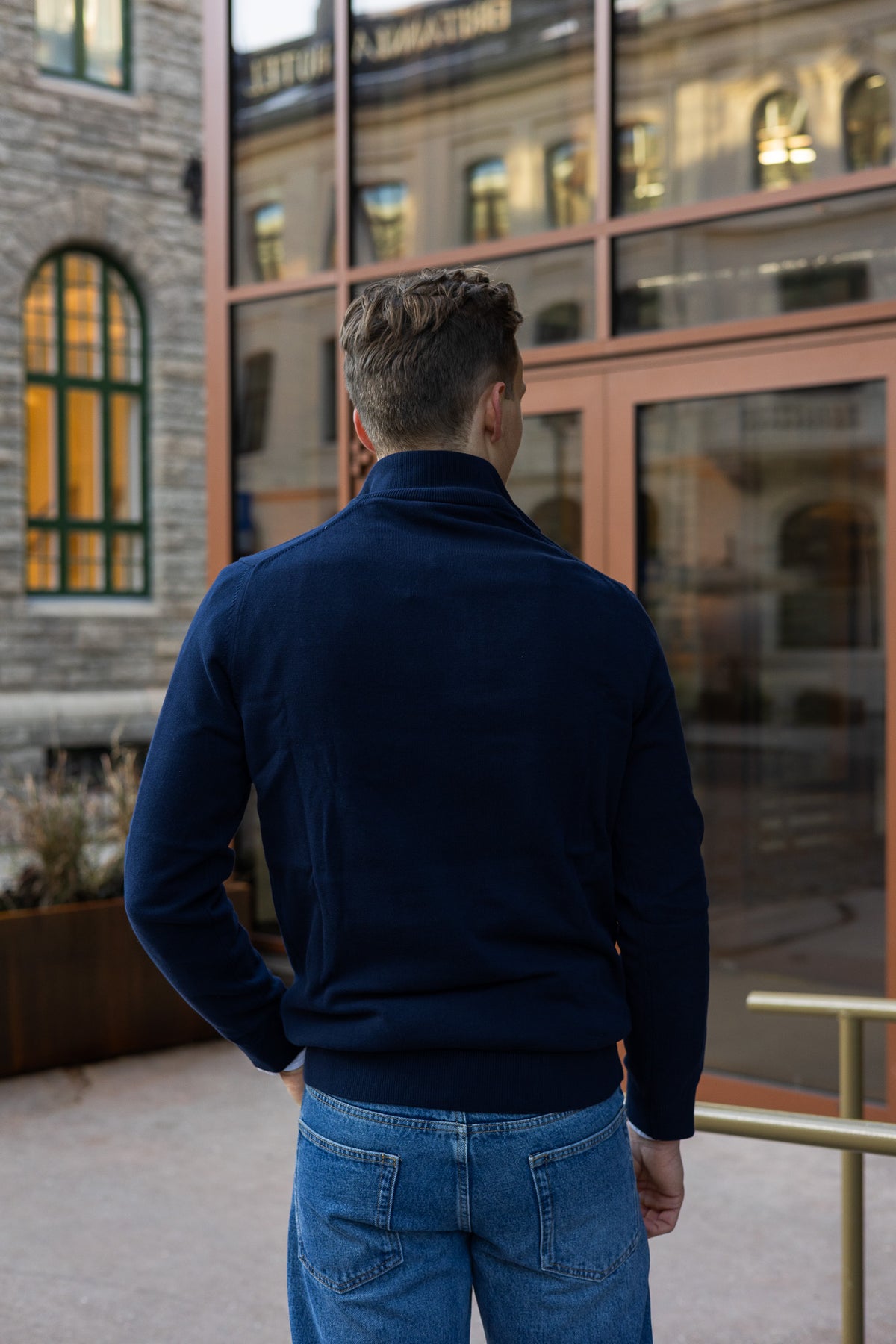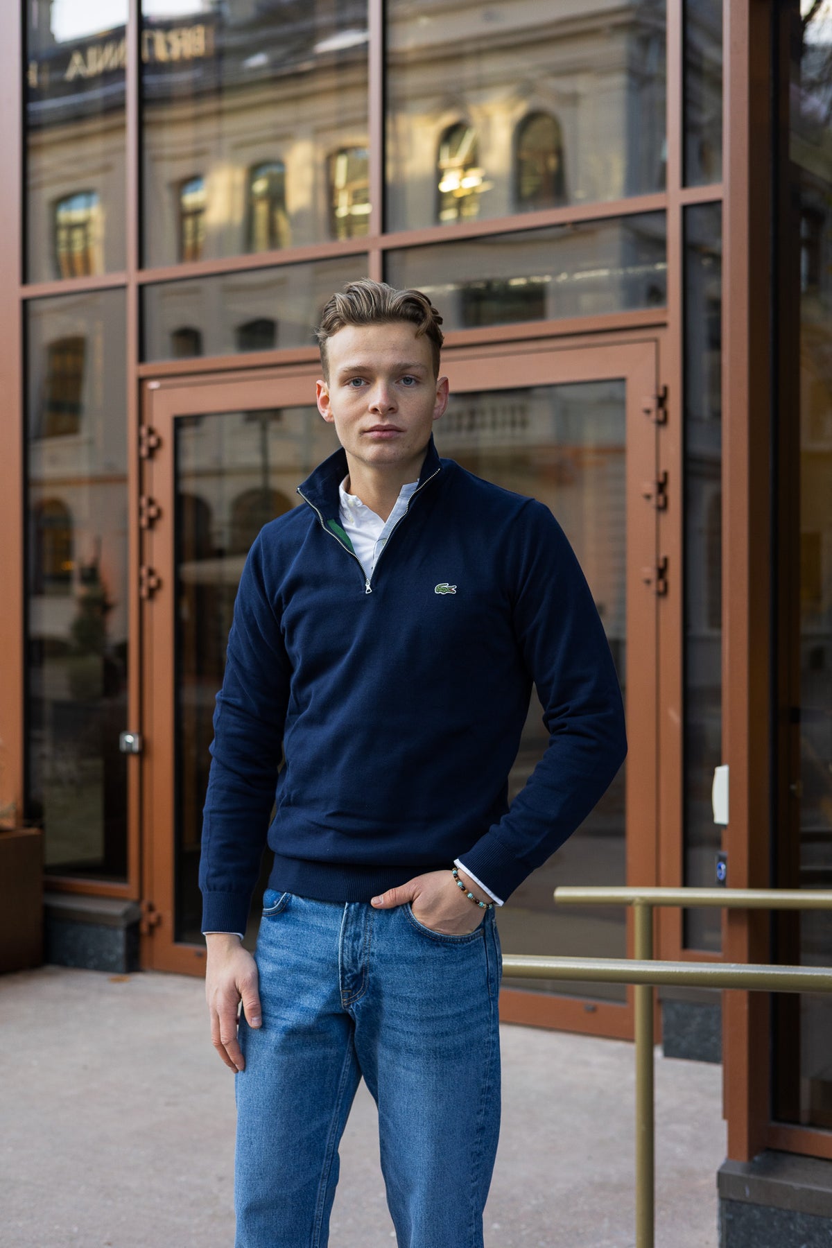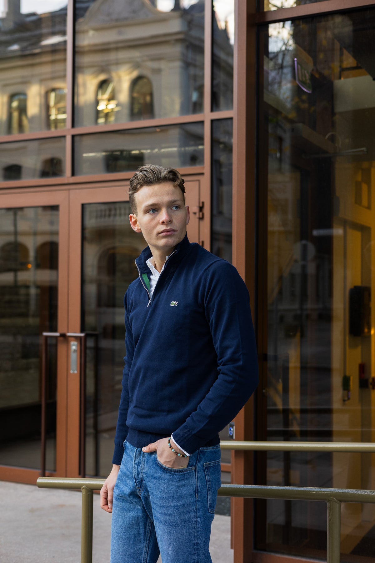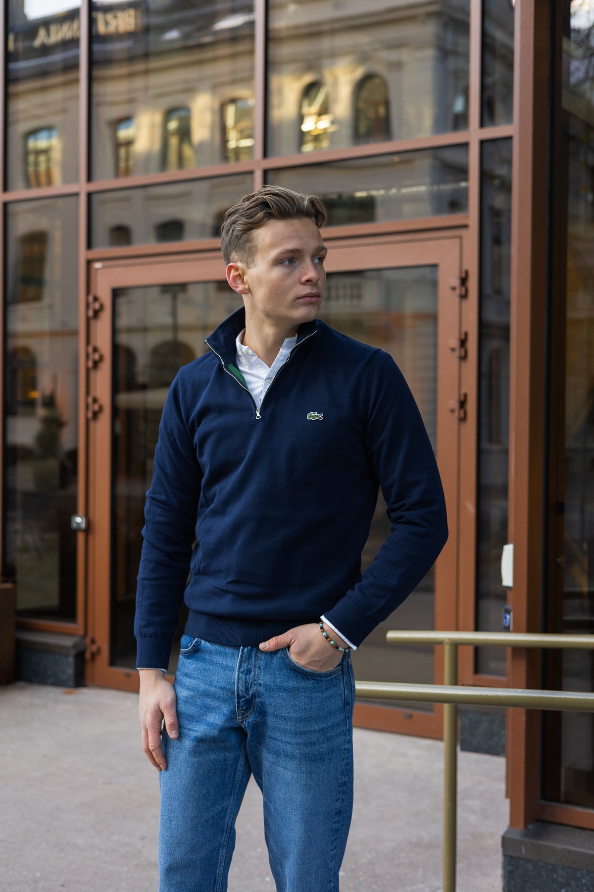 En klassisk quarter zip-genser fra Lacoste, laget i myk bomull for maksimal komfort. Genseren har grønn kontrast på innsiden av kragen og den ikoniske grønne krokodille-logoen brodert på brystet. Et tidløst og sporty plagg som passer perfekt til både hverdags og fritid.