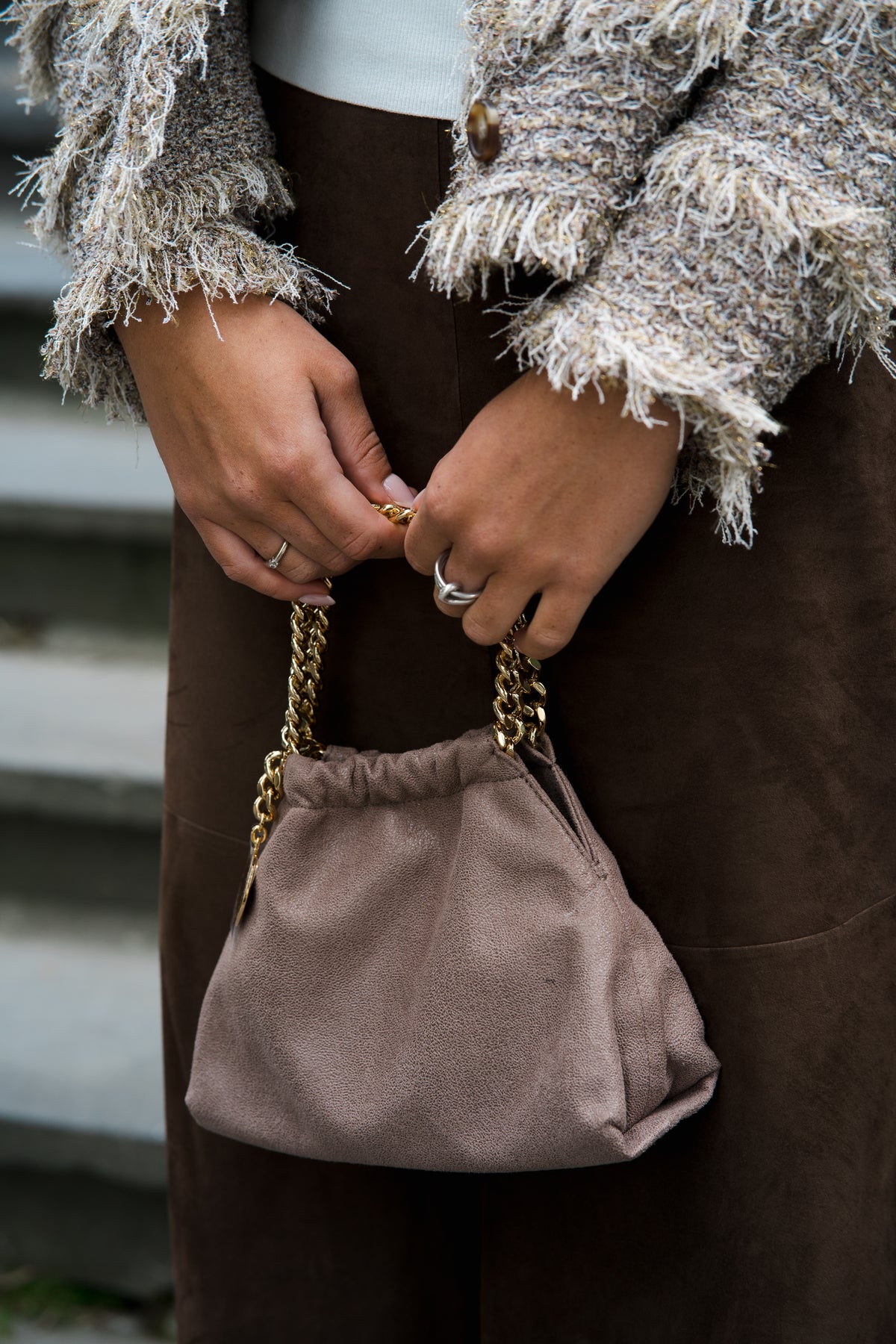 Falabella Mini Drawstring Bag fra Stella McCartney. Vesken har en signaturkede i diamantslipt resirkulert messing, og har nok plass til telefon, lommebok og andre nødvendigheter. Vesken har to håndtak på toppen, ett hovedrom og en innvendig glidelåslomme og magnetisk knappelukking. Perfekt til finere anledninger.