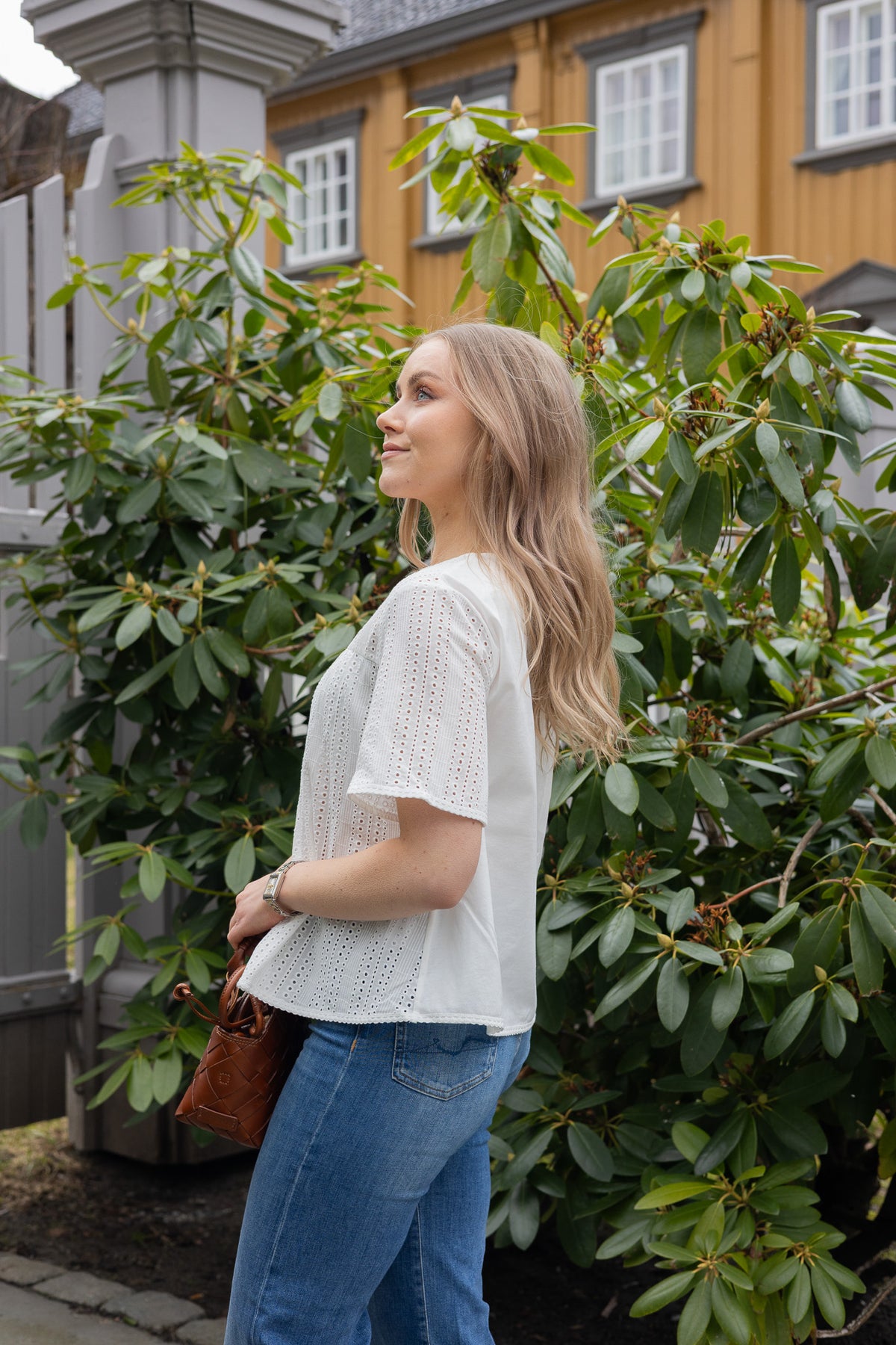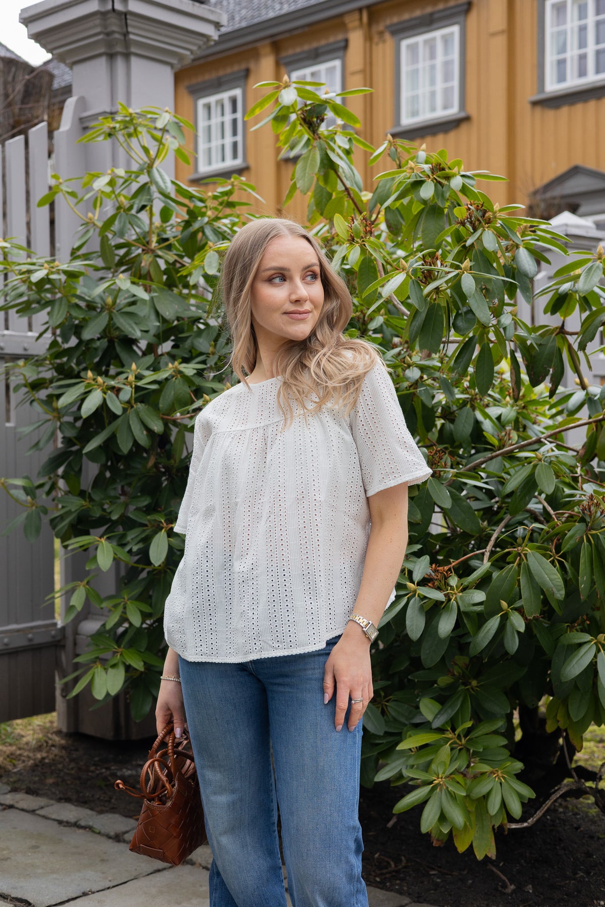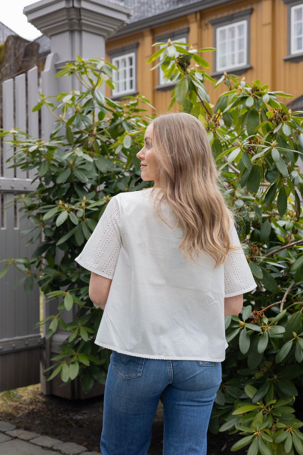 Editta fra Max Mara Weekend. En vakker topp med rund hals, laget i bomullspoplin. Toppen har en boxy passform med korte ermer, nydelige detaljer foran og på ermene. Style den sammen med en bukse eller et skjørt.