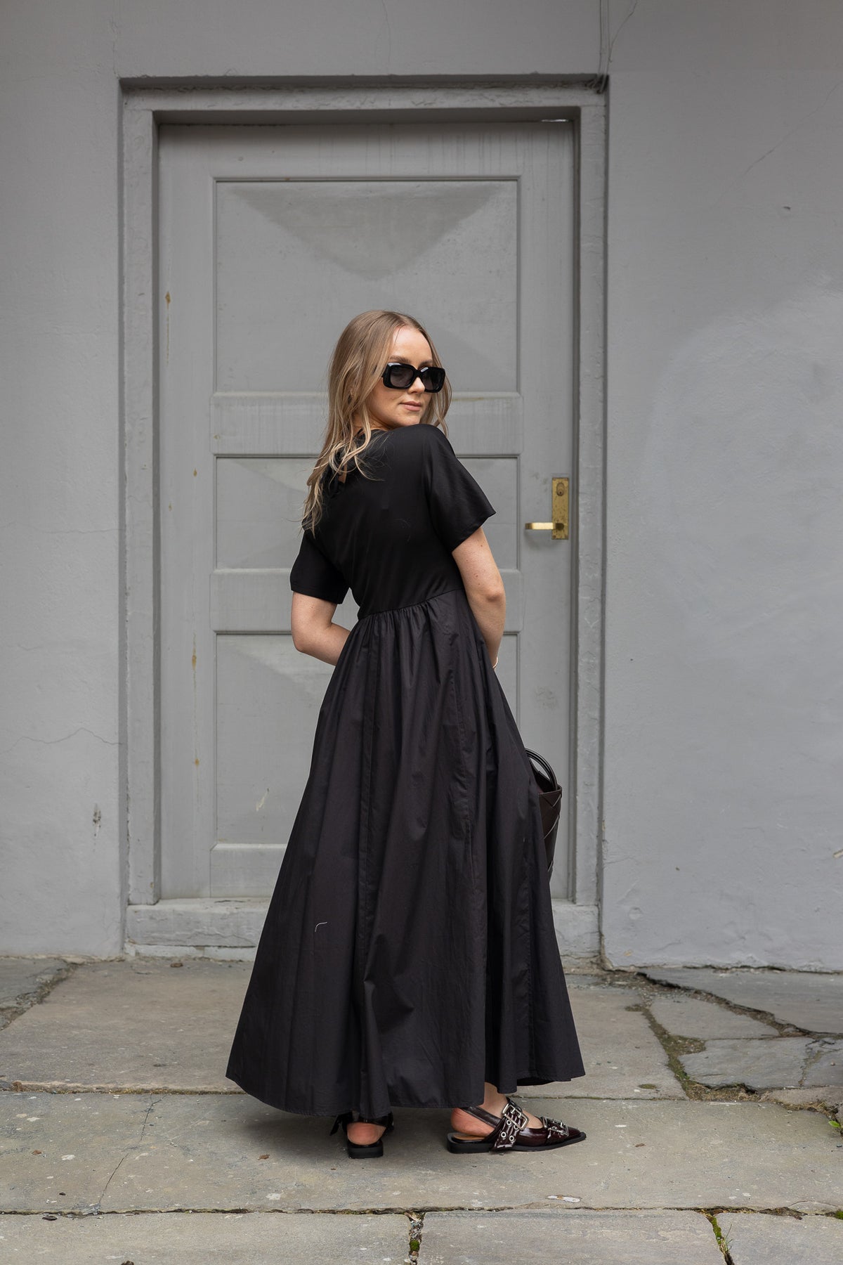 Bronzo fra Max Mara Weekend. En lang kjole med en topp i bomullsjersey og et poplinskjørt i bomull med dekorative vertikale sømmer, og rynker i midjen. Kjolen har en bred V-hals, korte kinmonoermer, sidelommer og en dråpefeste bak med knyting. Kjolen er perfekt til hverdagsbruk og kan styles både opp og ned.