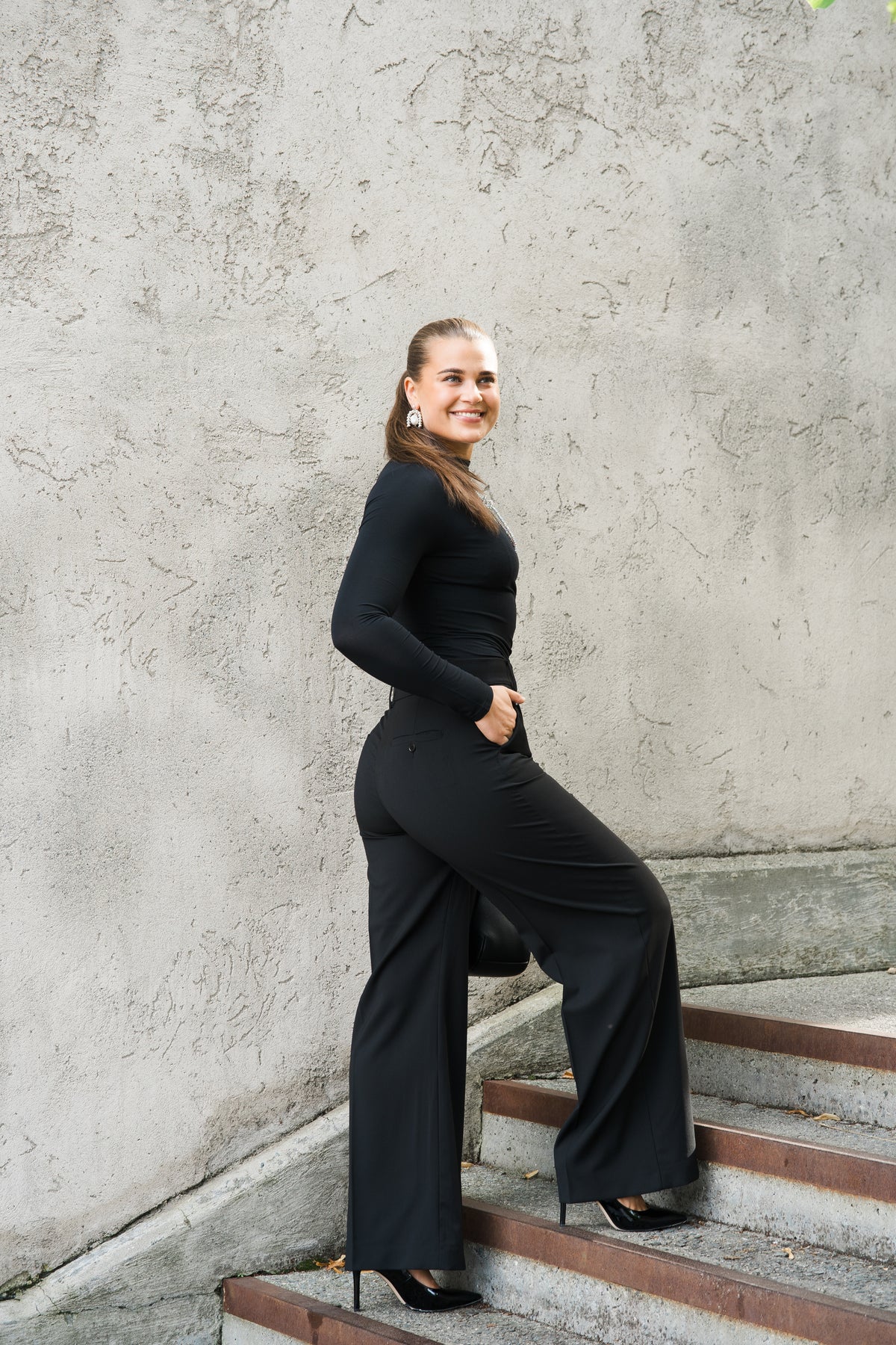 Visivo fra Max Mara Weekend. Elegante Palazzobukser, en tidløs og sofistikert tilnærming til moderne eleganse. Disse buksene er laget av en fin og lett ullkvalitet, med naturlig stretch, som gir en luksuriøs følelse og en smigrende passform. Buksen har vide ben med plisserte detaljer, en elegant silhuett, med skrålommer og paspolerte baklommer med knapper. Style de sammen med tilhørende blazer.