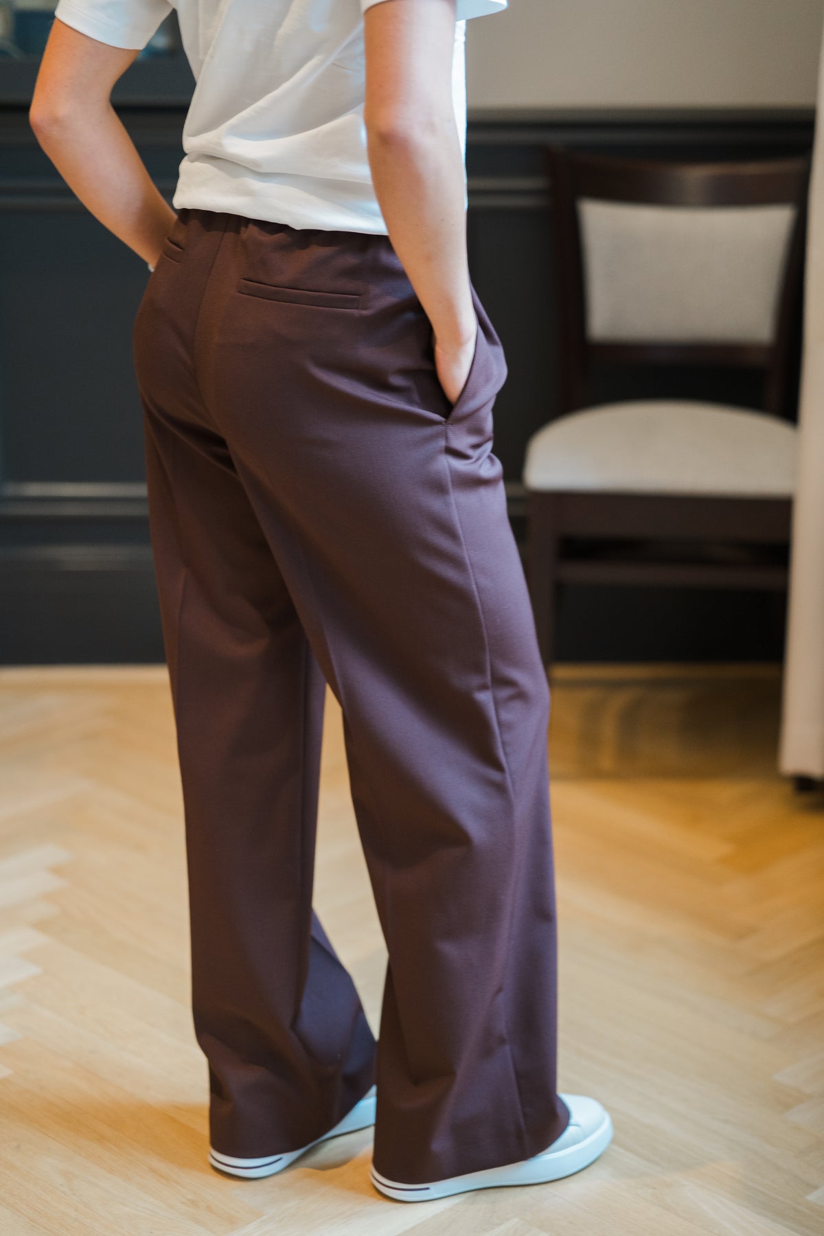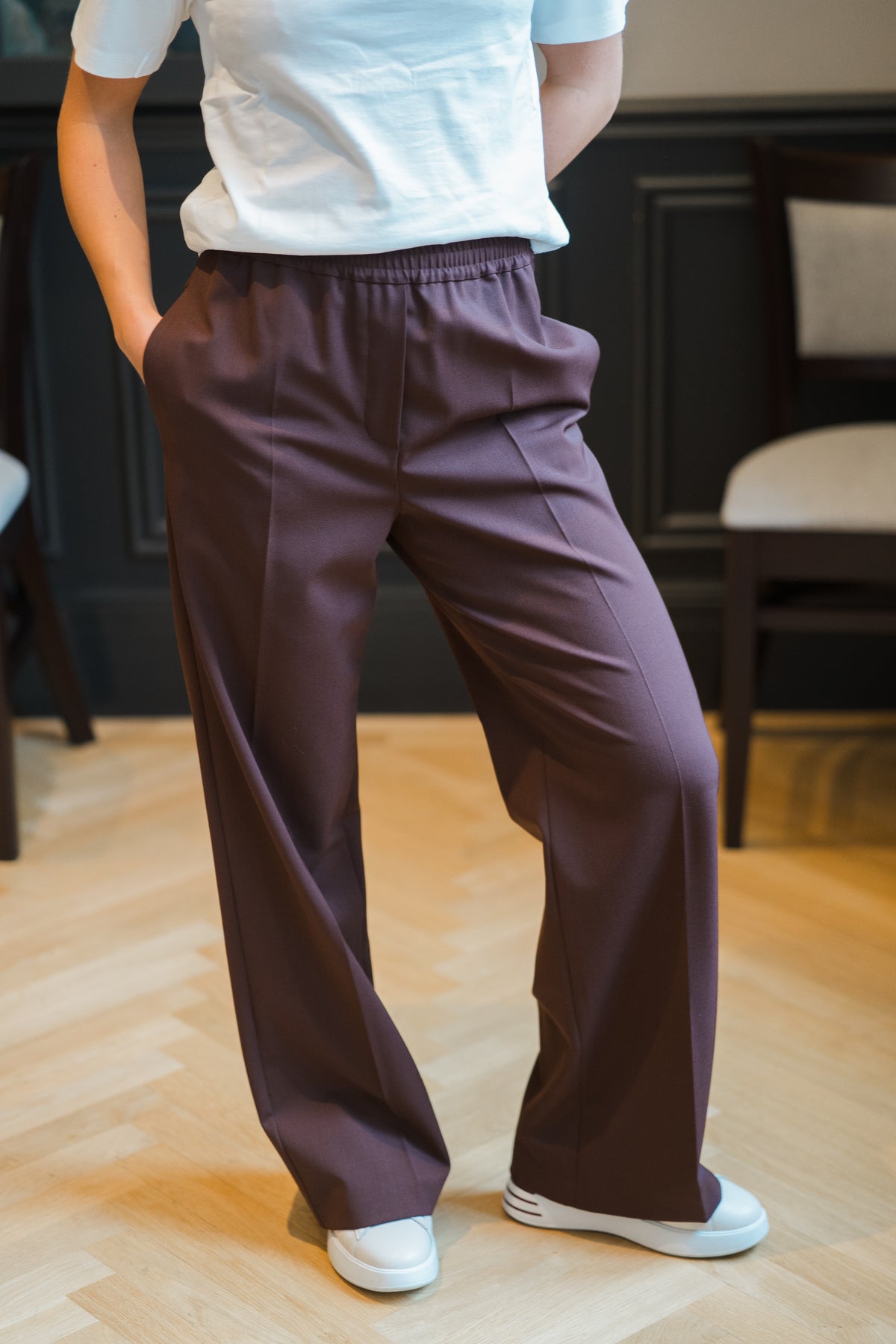 Petra fra Max Mara Weekend. Petra er et par vide bukser i en ullblanding med enkel legg, elastisk linning og stikklommer. Perfekt til kontoret og hverdagen.