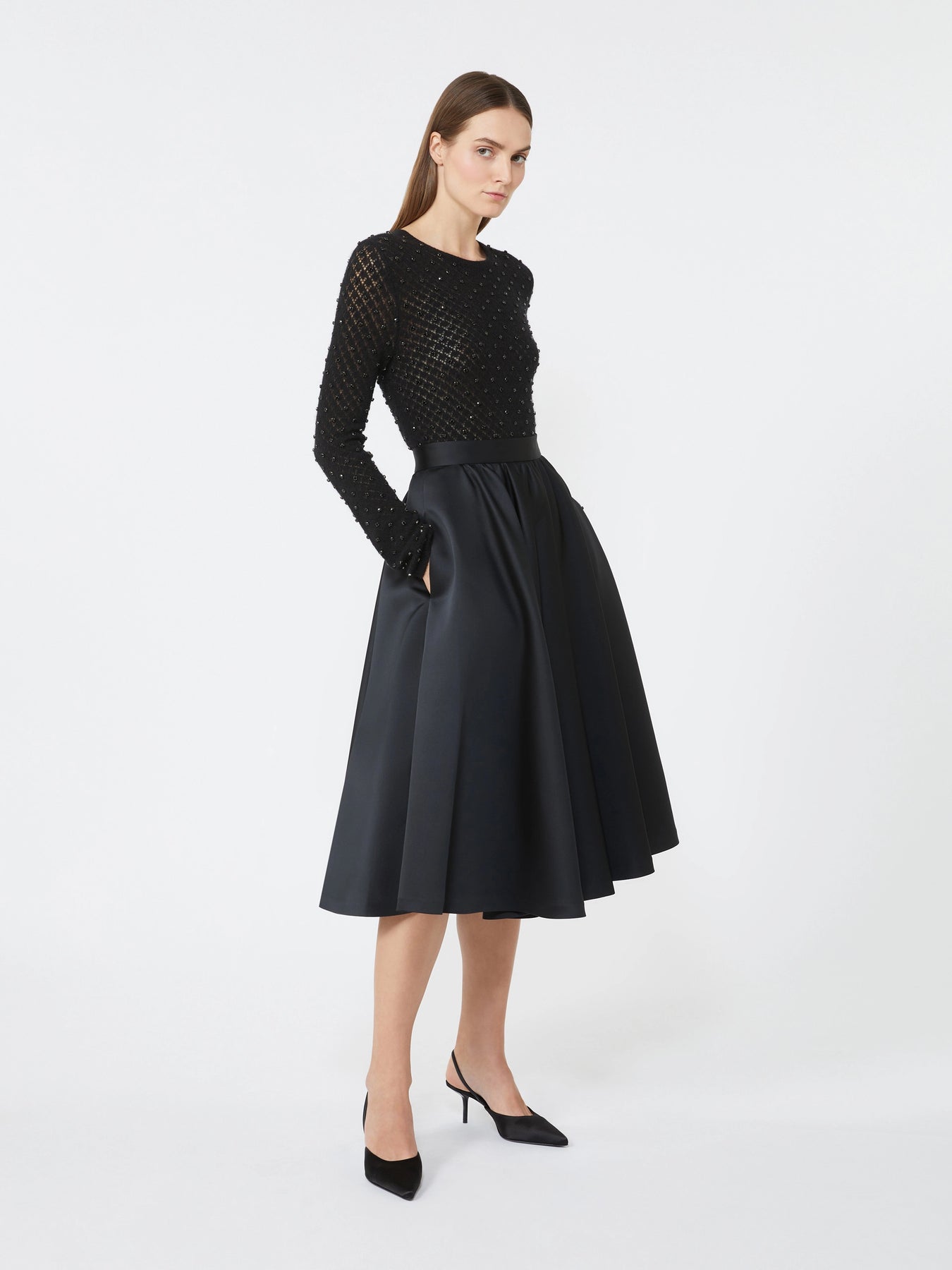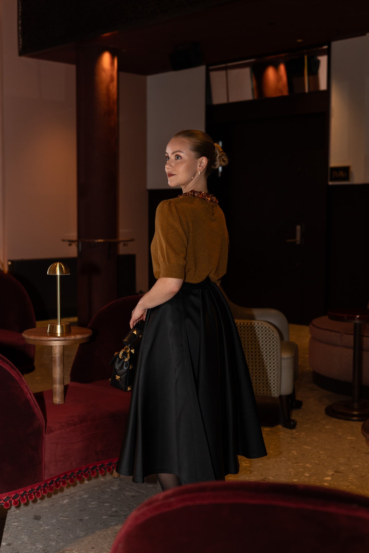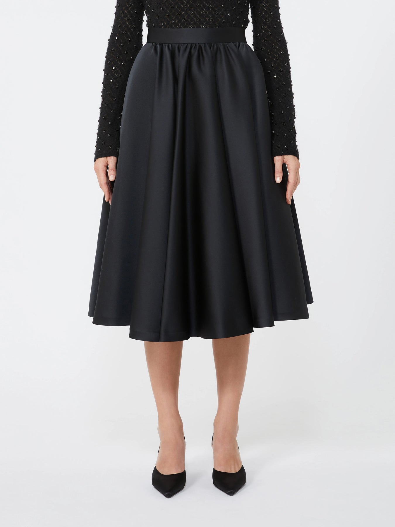 Denne midi-skjørtet har en couture-inspirert silhuett med en elegant, svingende A-form. Skjørtet er laget av strukturert duchesse-satin som fremhever fasongen og gir et raffinert visuelt uttrykk.