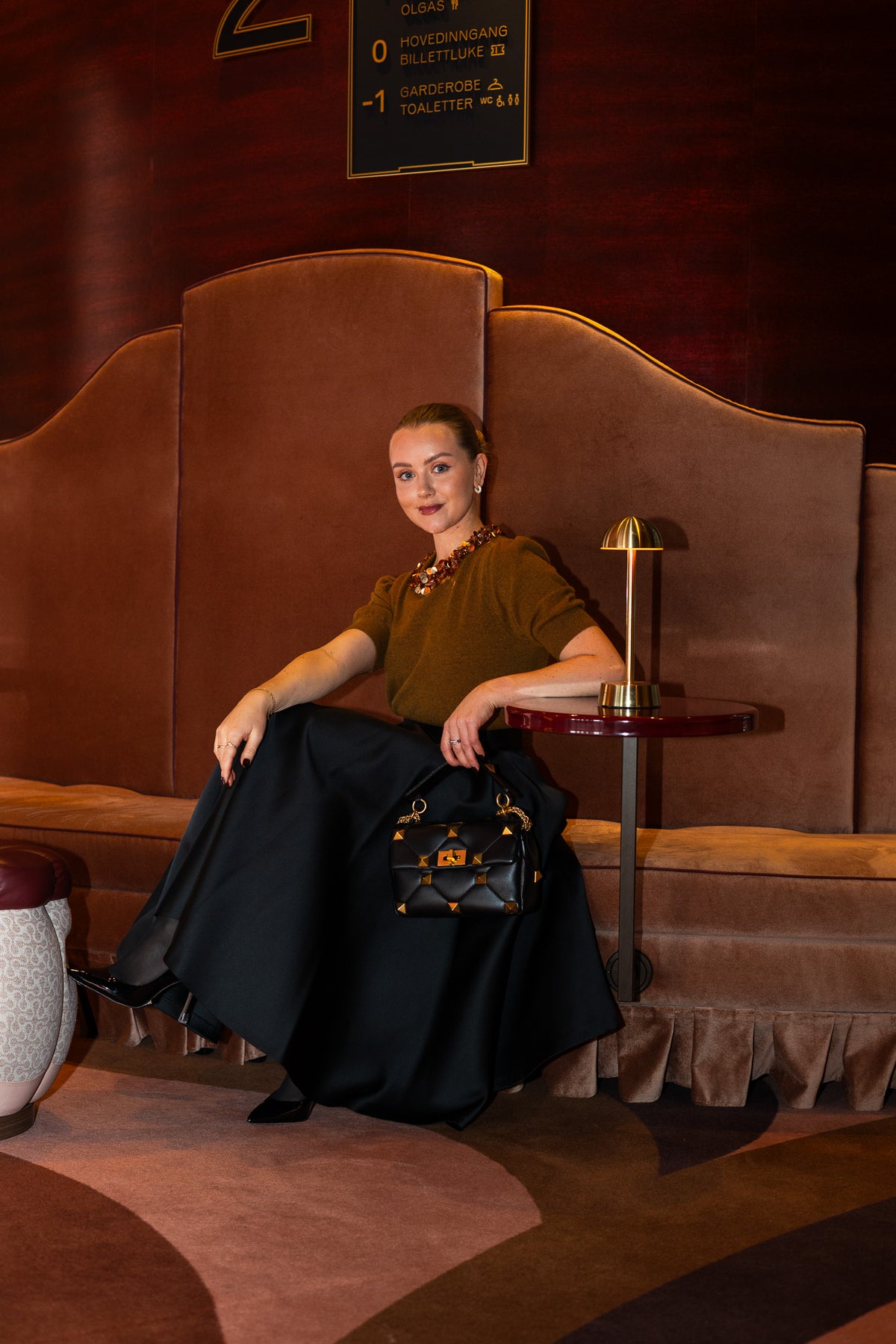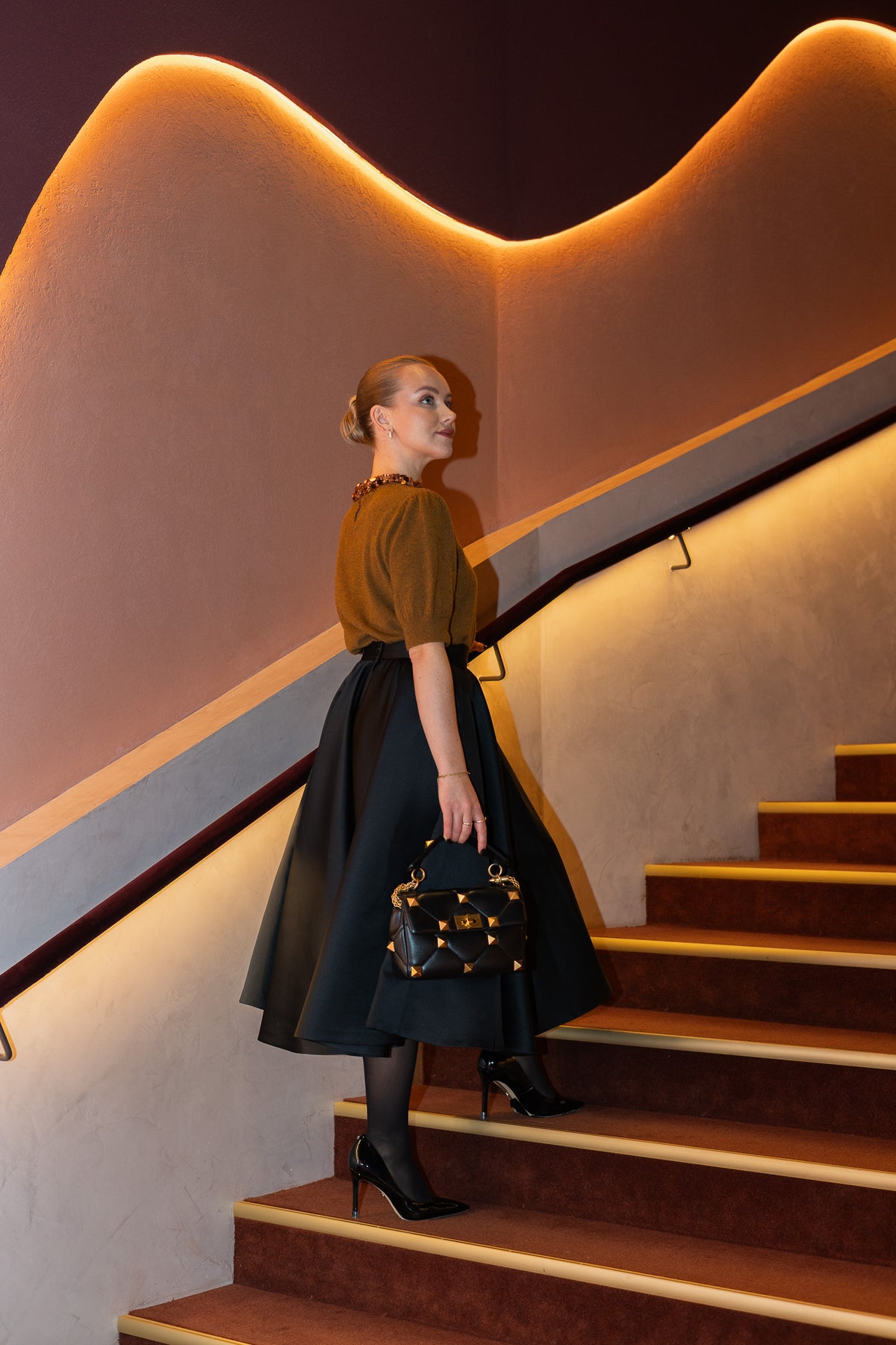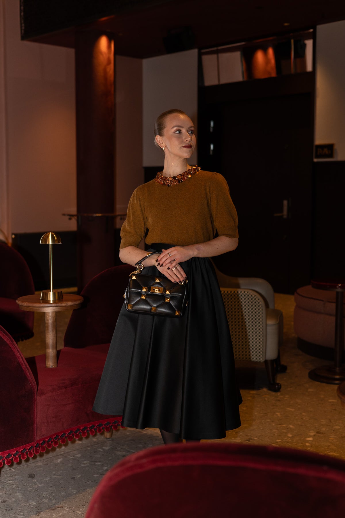 Denne midi-skjørtet har en couture-inspirert silhuett med en elegant, svingende A-form. Skjørtet er laget av strukturert duchesse-satin som fremhever fasongen og gir et raffinert visuelt uttrykk.