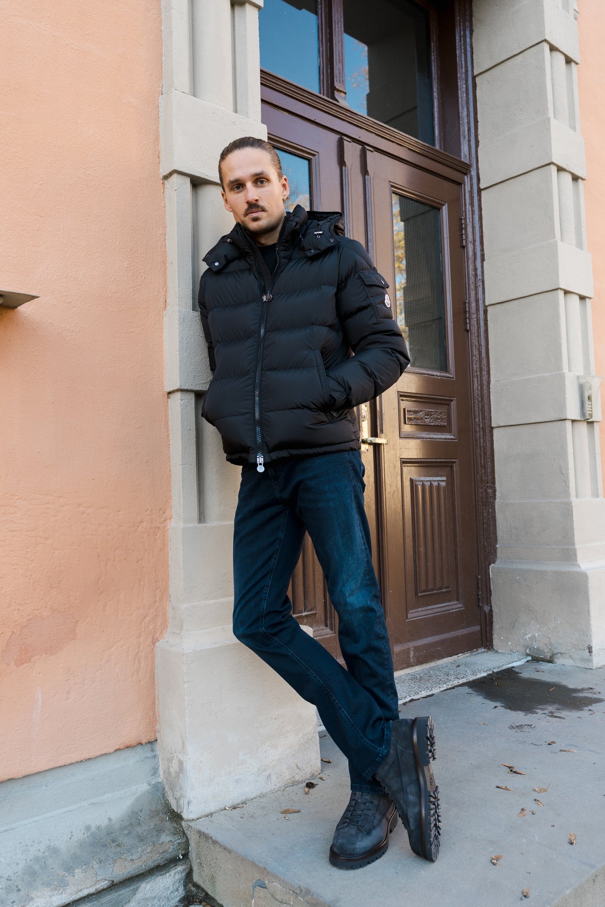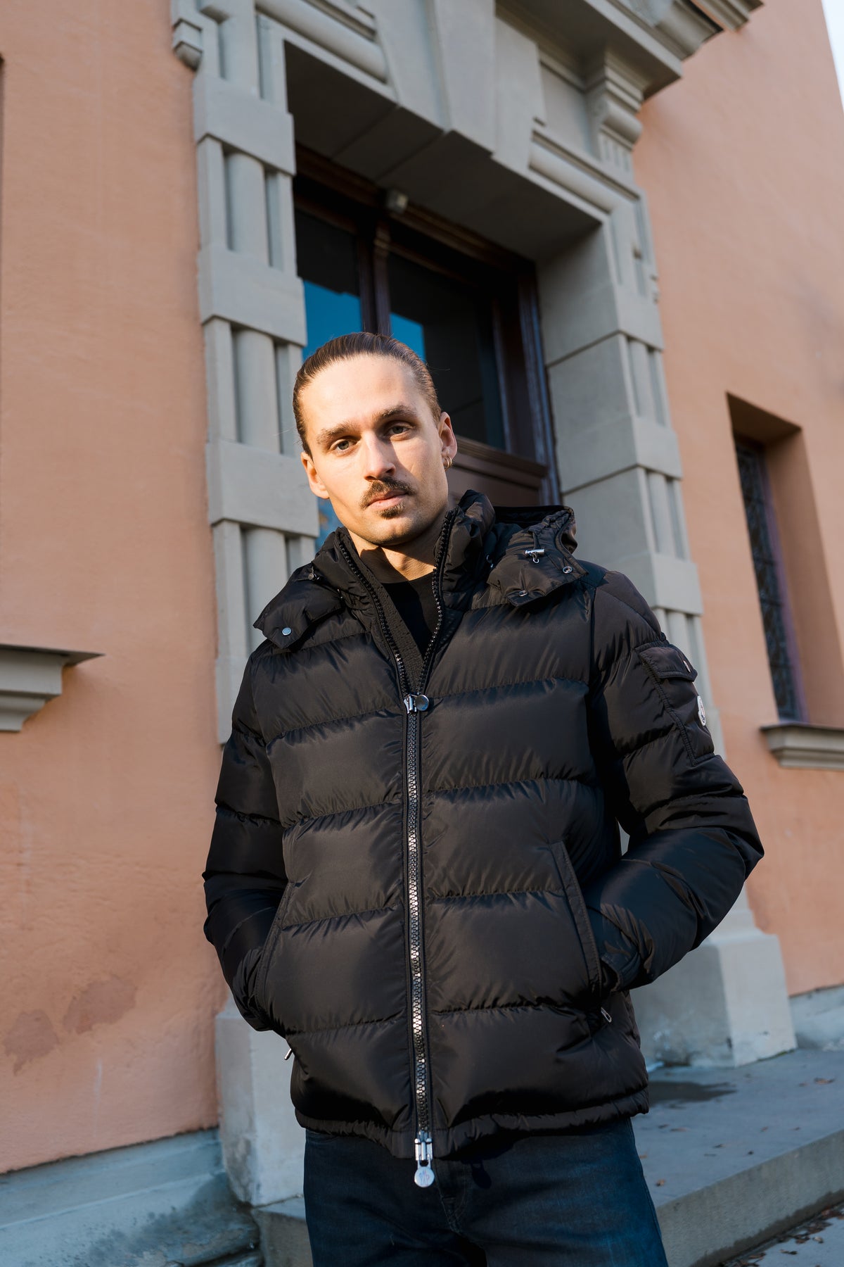 Den har vannavvisende hovedmateriale, nylonfôr og er fylt med dun for optimal varme. Jakken lukkes med glidelås og trykknapper, og har glidelåslommer samt justerbar nedre kant med snor.