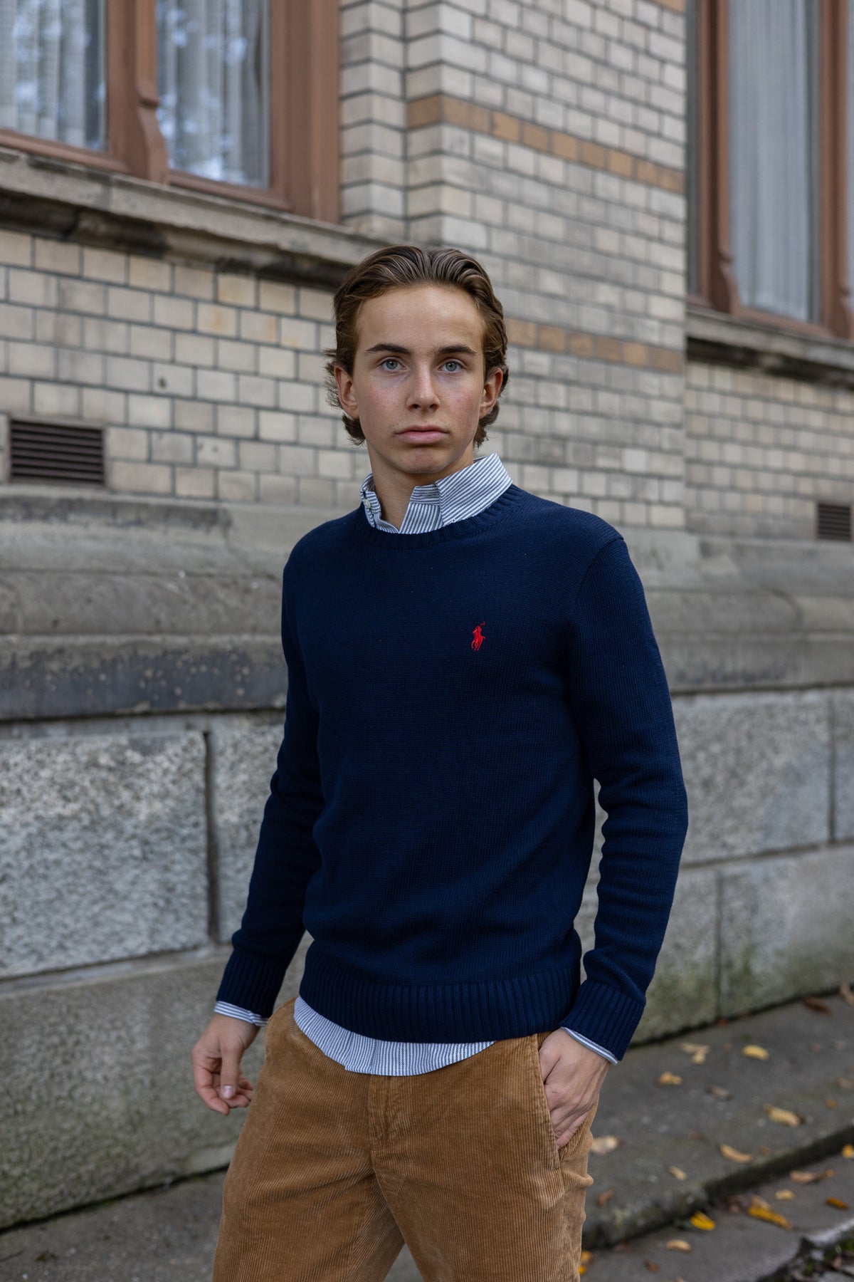 En klassisk genser med rund hals fra Ralph Lauren, laget i myk og lett bomullsblanding. Pen ribbestrikk ved halslinning, mansjetter og linning gir et raffinert uttrykk og sikrer god passform. Tidløs og allsidig – utmerket som et komfortabelt mellomlag om våren og høsten, og like fin med chinos som under en dressjakke for et mer avslappet business-casual utseende.