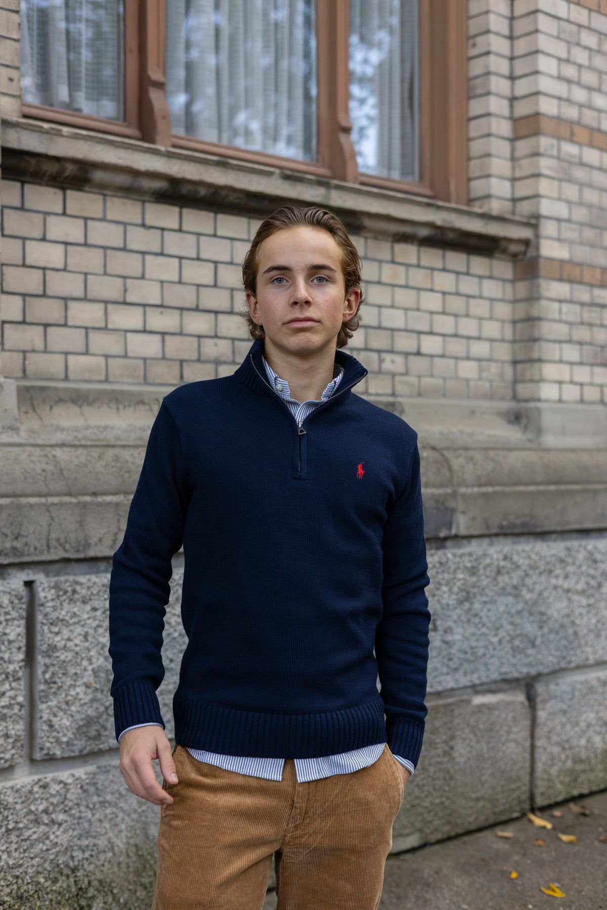 En klassisk og allsidig quarter zip genser i myk bomullskvalitet. Denne i dyp hunter-blå farge har ribbestrikkede detaljer på krage, mansjetter og linning, og glidelåsen gir muligheten for justert lufting og stil – bruk den lukket for en ryddig look, eller åpen med skjorte under for et mer avslappet uttrykk.