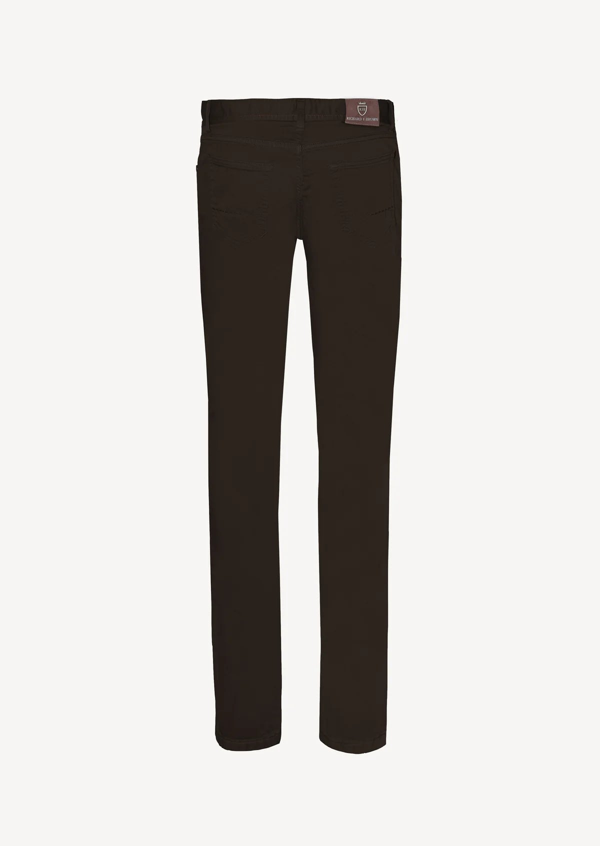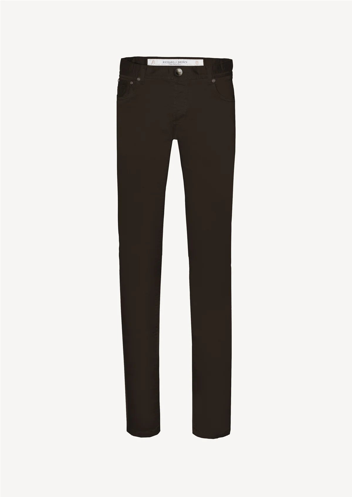 Tokyo-modellen fra Richard J Brown er en moderne herrebukse laget i Italia av en myk og slitesterk bomullsblanding med stretch som gir god komfort og bevegelighet gjennom hele dagen. Buksen har slim fit passform og klassisk 5-lommers design, med gjennomførte detaljer som håndsøm på baklommen og pent avsluttede innvendige sømmer med bomullskanter. Innvendige lommer er fôret med bomull for ekstra komfort og holdbarhet. Dette er en allsidig bukse som passer like godt til hverdagsbruk som til mer pyntede anledninger, og som enkelt kan styles med skjorte, strikk eller blazer for et rent og tidløst uttrykk.