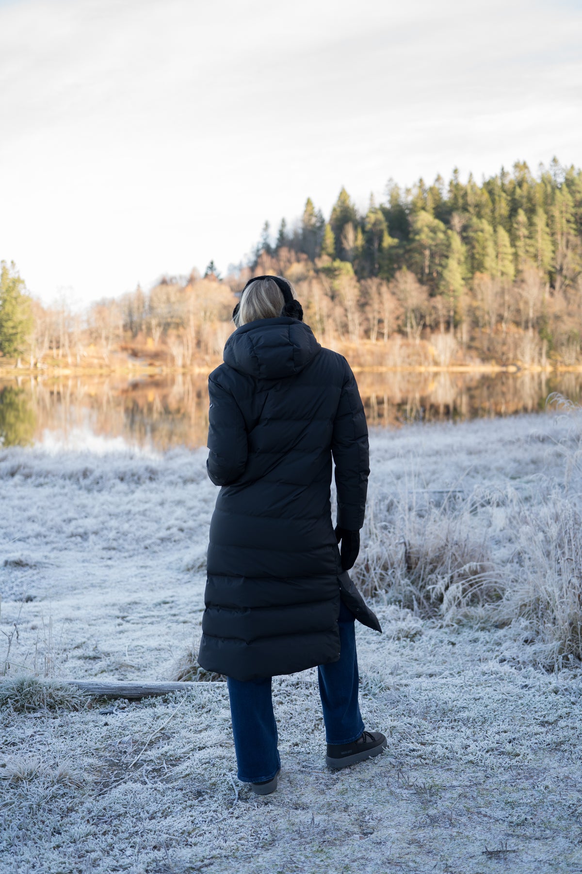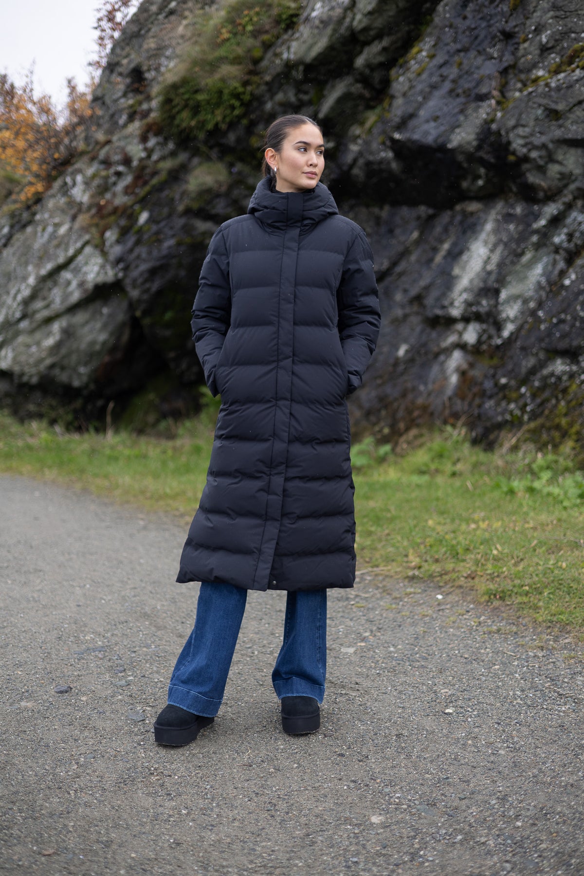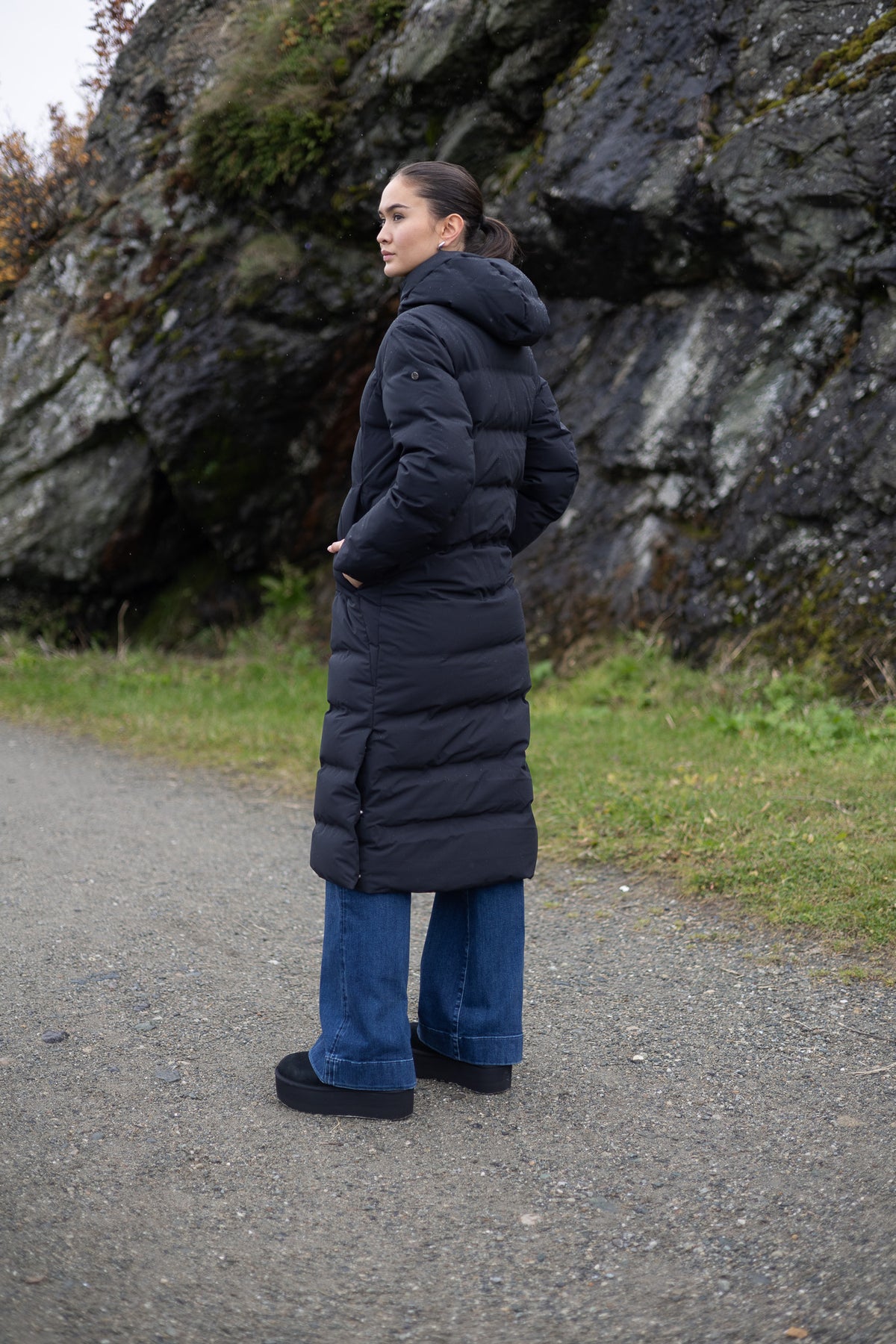 Meridian fra Scandinavian. En lang og elegant kåpe med en smal silhuett, fylt med 90/10 RDS-sertifisert dun for en perfekt puffet følelse, utseende og varme. Ytterstoffet er vindtett-og vannavstøtende. Jakken har splitt i sidene med trykknapper, toveis glidelåslukking, midjelommer og hette med høy krage.
