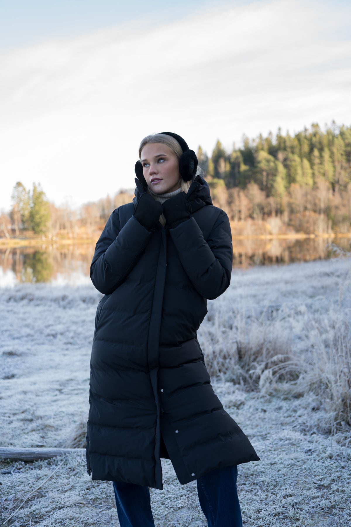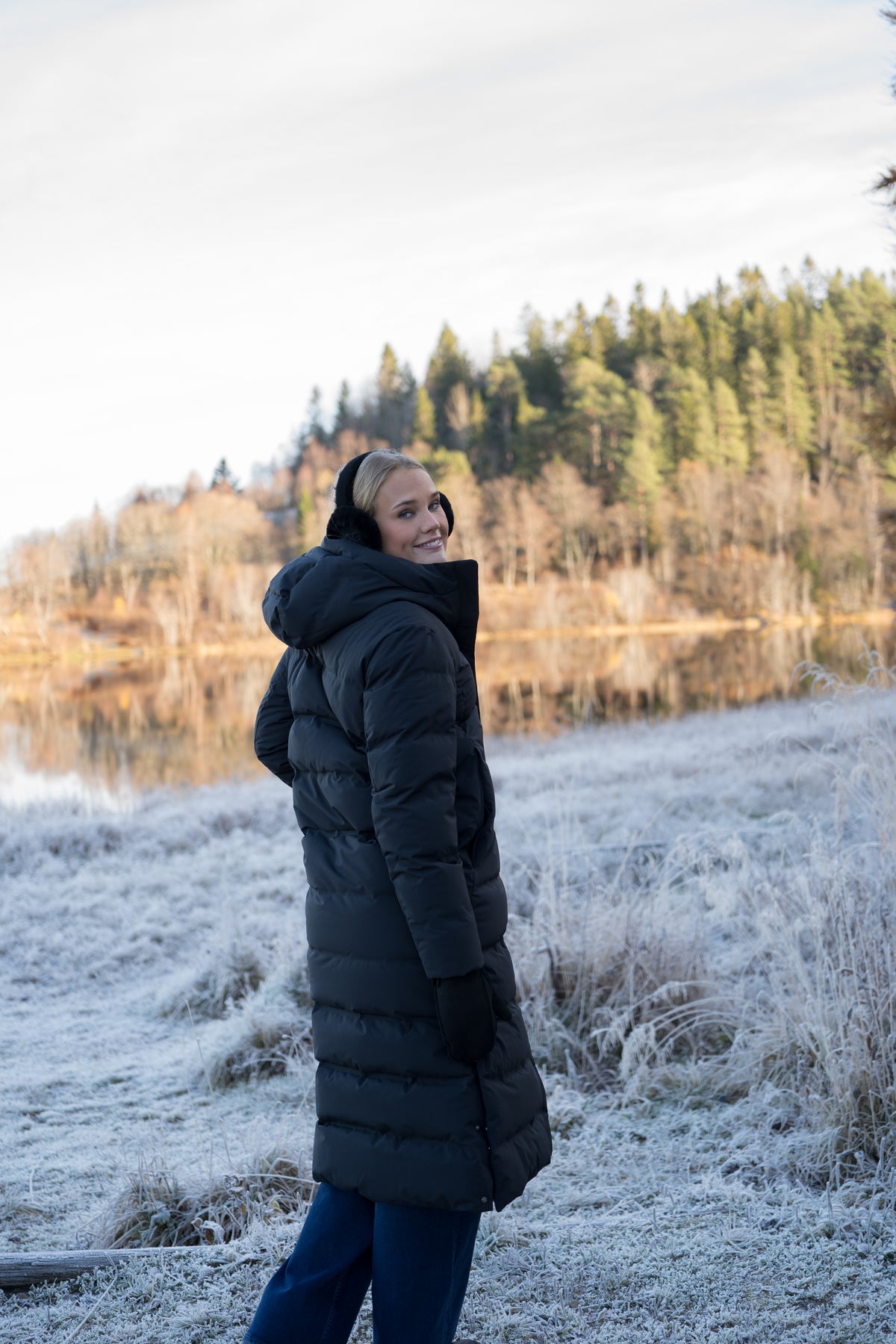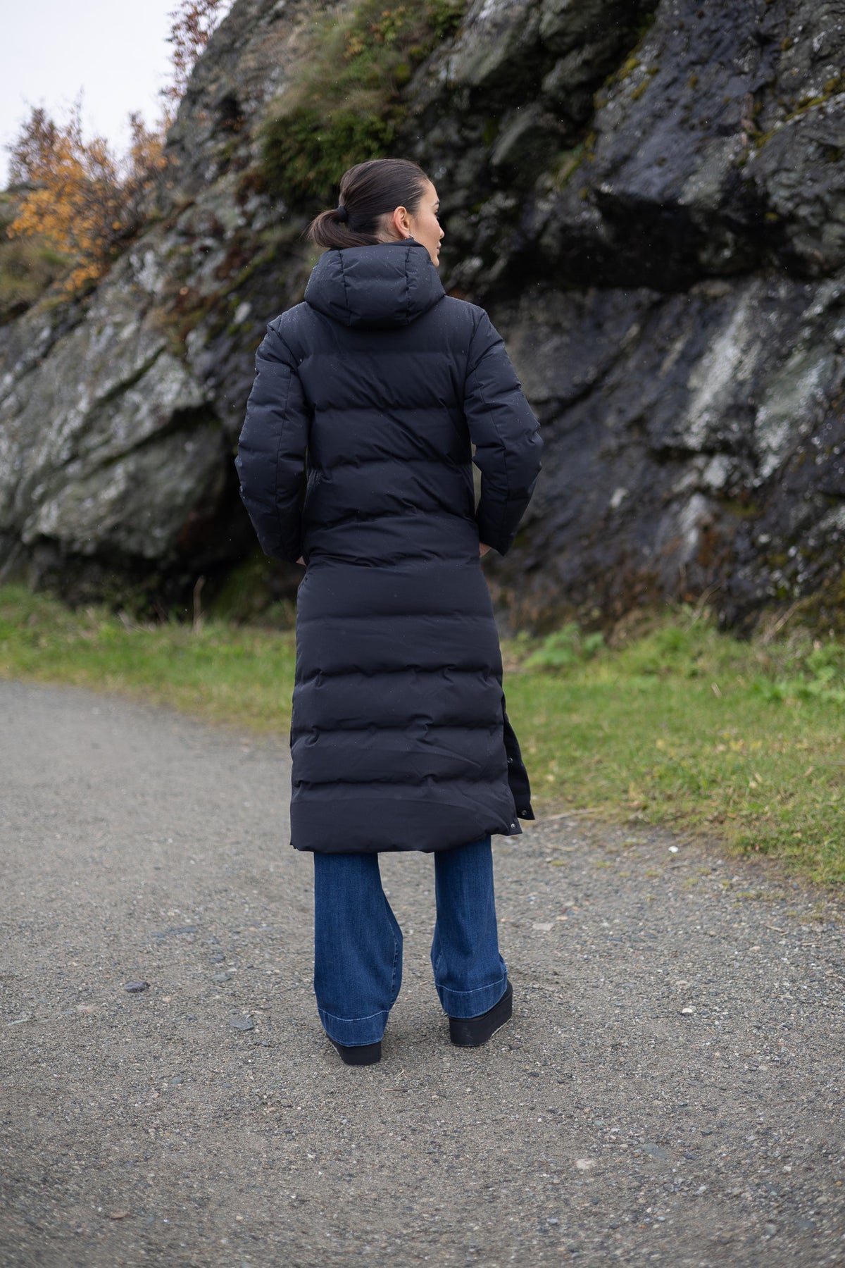 Meridian fra Scandinavian. En lang og elegant kåpe med en smal silhuett, fylt med 90/10 RDS-sertifisert dun for en perfekt puffet følelse, utseende og varme. Ytterstoffet er vindtett-og vannavstøtende. Jakken har splitt i sidene med trykknapper, toveis glidelåslukking, midjelommer og hette med høy krage.