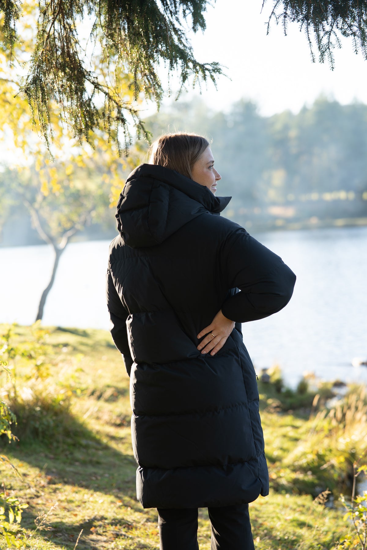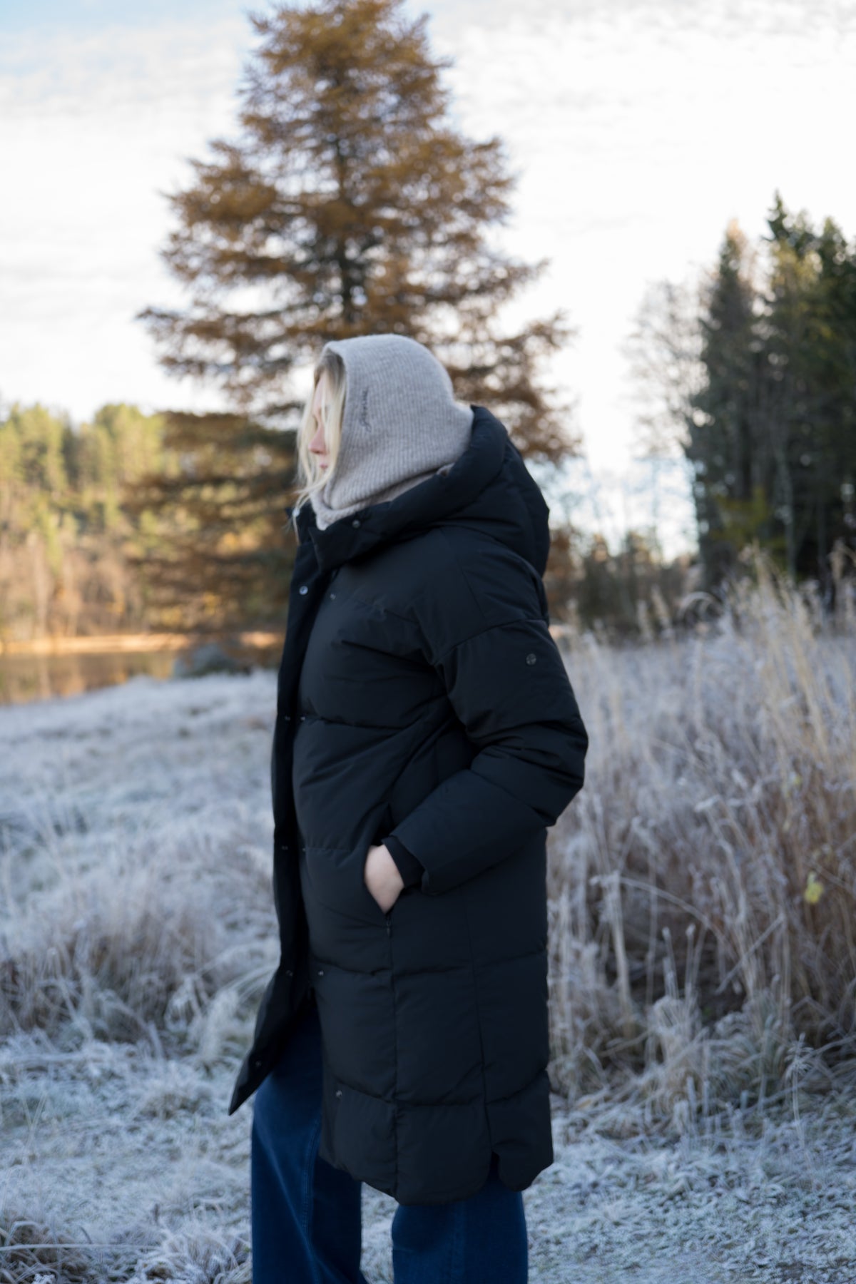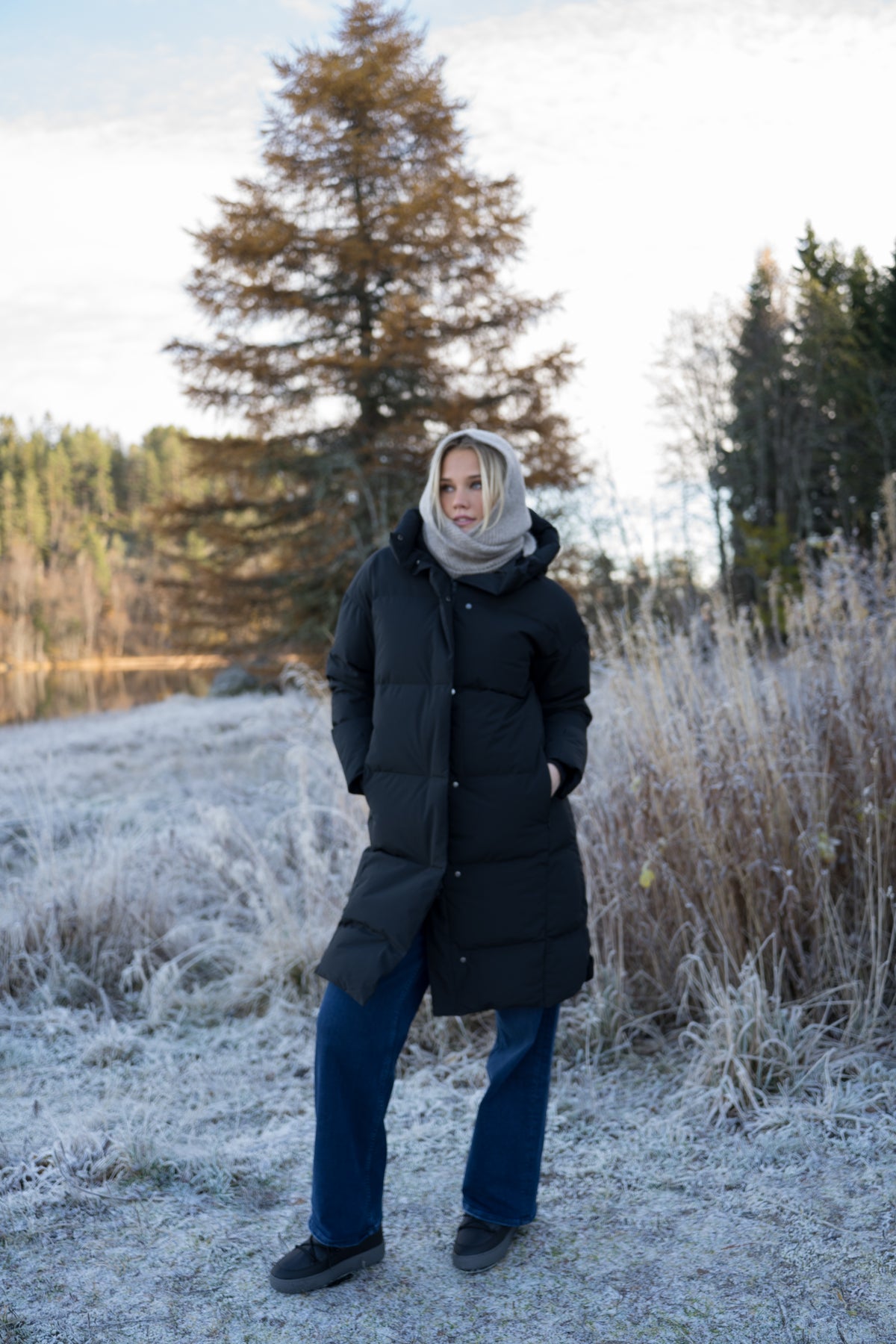 Swell III fra Scandinavian Edition. En lekker oversized dunkåpe fylt med 90/10 RDS-sertifisert dun. Dunkanalene er ved sammen på en måte som gir en renere konstruksjon sammenlignet med en klassisk søm. Jakken har høy krage, fast hette, glidelåsukking og sidelommer. Den er vindtett, og tåler 20 000 mm vannsøyle, og har en pustende toveis mekanisk stretchstoff.