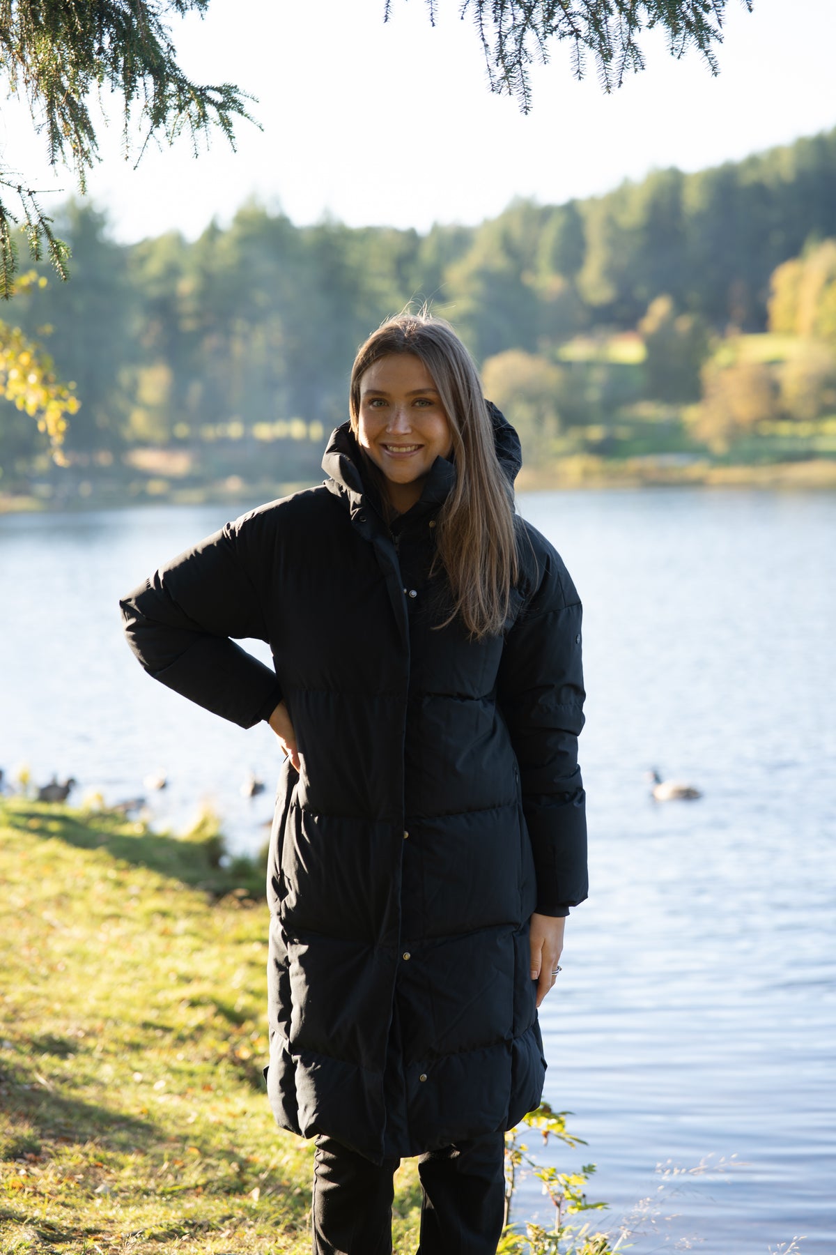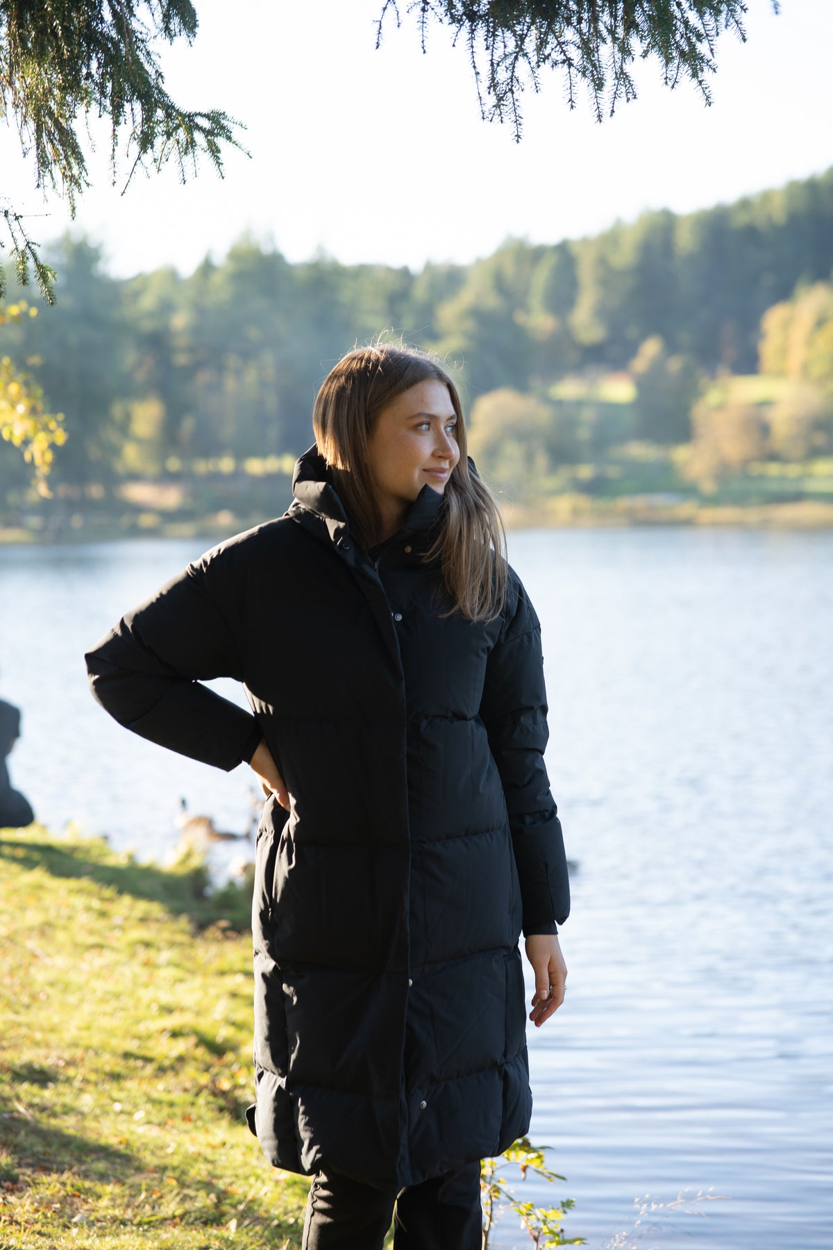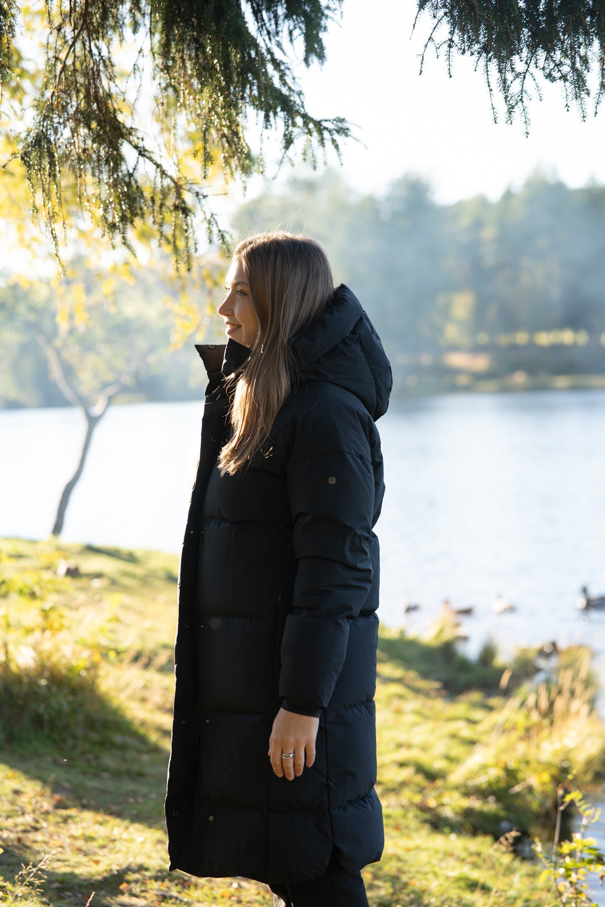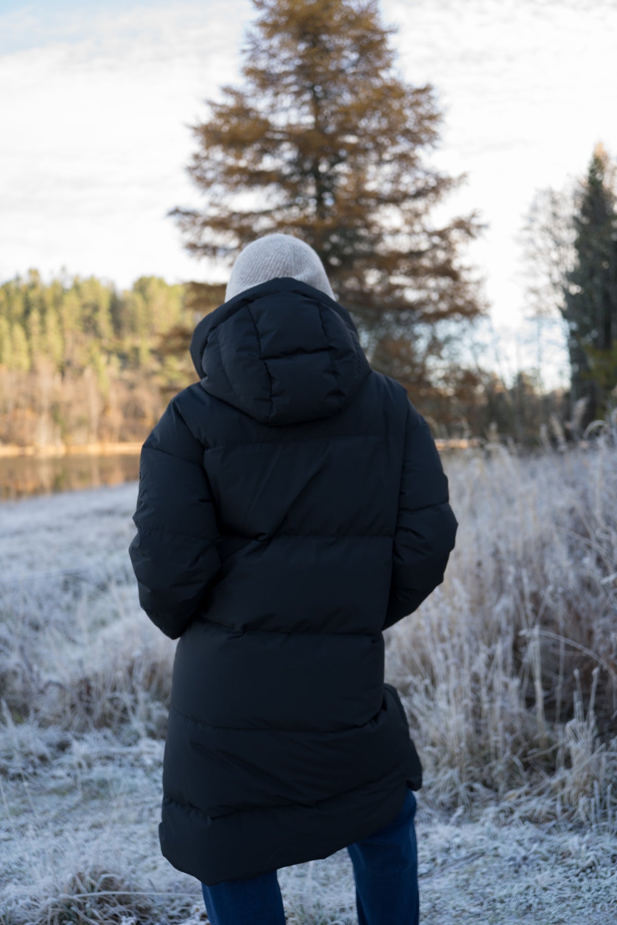 Swell III fra Scandinavian Edition. En lekker oversized dunkåpe fylt med 90/10 RDS-sertifisert dun. Dunkanalene er ved sammen på en måte som gir en renere konstruksjon sammenlignet med en klassisk søm. Jakken har høy krage, fast hette, glidelåsukking og sidelommer. Den er vindtett, og tåler 20 000 mm vannsøyle, og har en pustende toveis mekanisk stretchstoff.