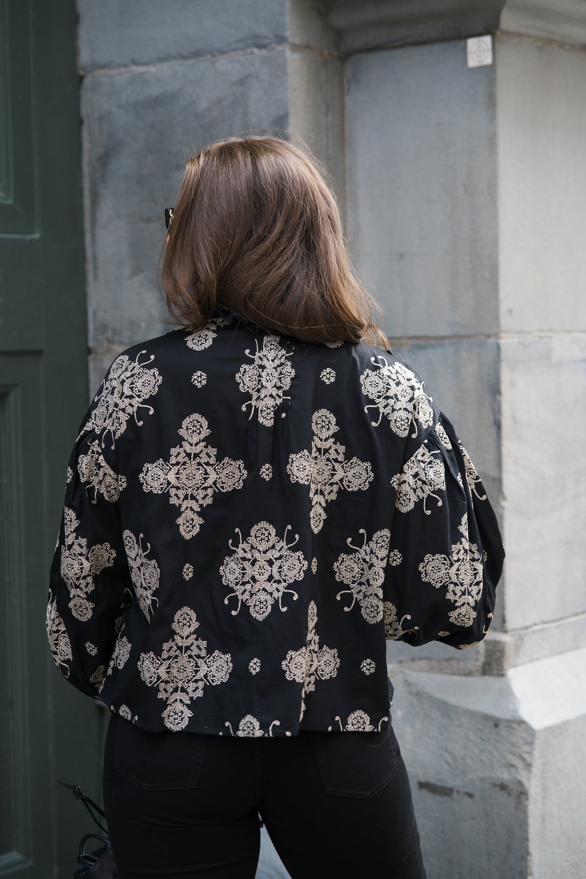 Boulevard top fra Scarlett Poppies. Denne toppen er en elegant topp laget i 100% bomullssateng. Den myke bomullskvaliteten kombineres med delikate broderinger, en v-hals som lukkes med knapper i front. Ermene er voluminøse, med knapp på mansjetten og en luftig fasong.