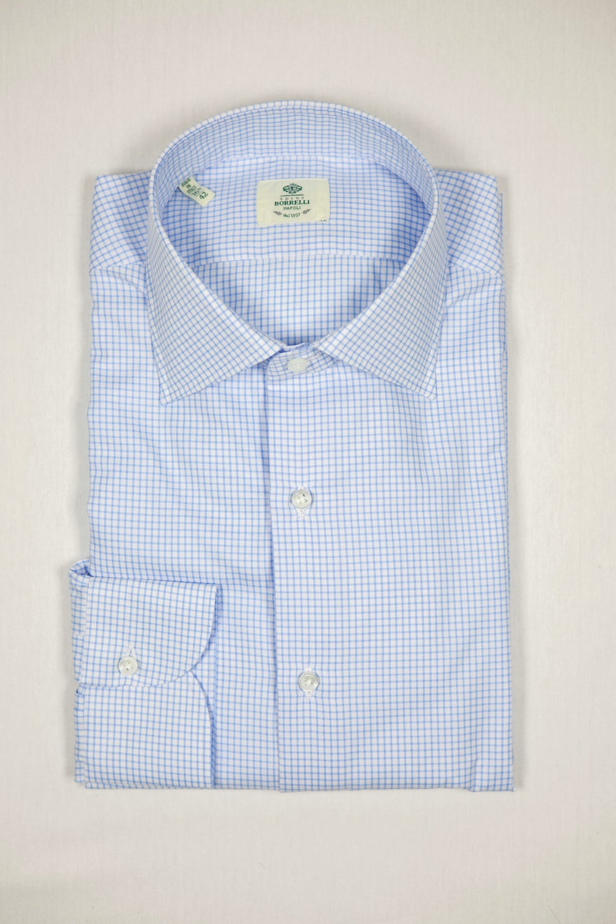 En elegant og tidløs skjorte fra Luigi Borrelli som balanserer klassisk mønster med raffinert italiensk håndverk. Den lyseblå og hvite ruten gir et sofistikert uttrykk som fungerer like godt formelt som mer avslappet.