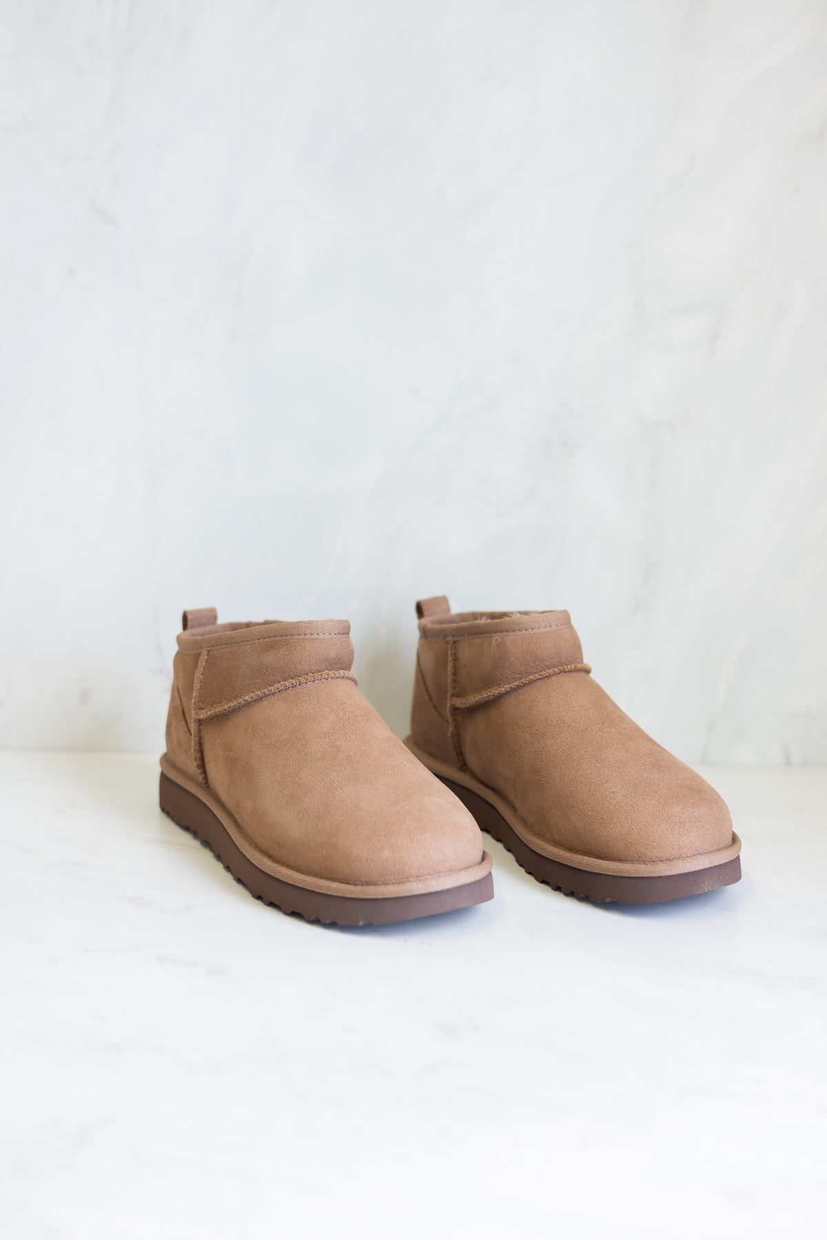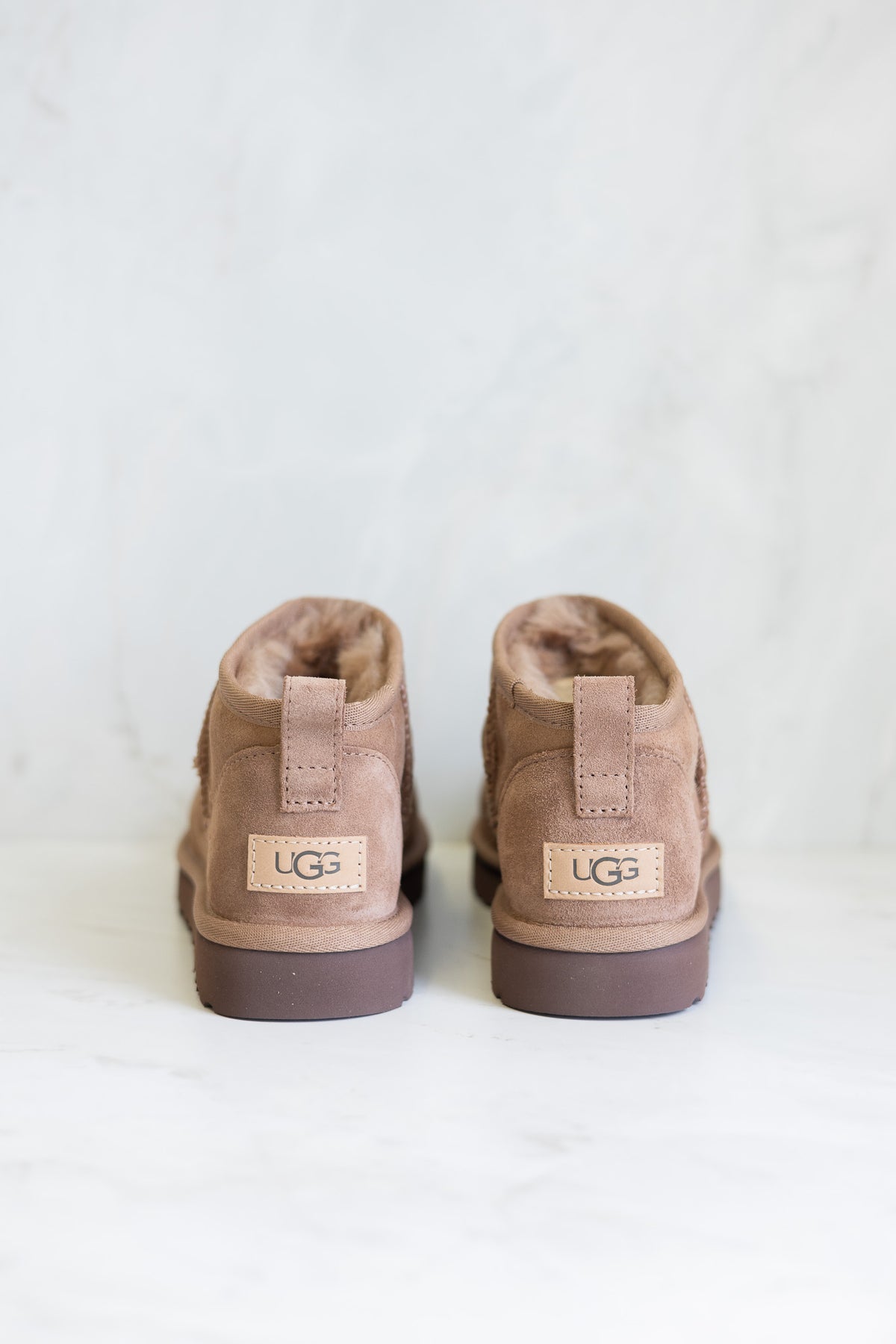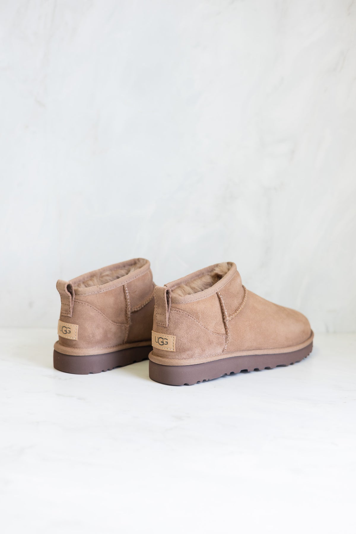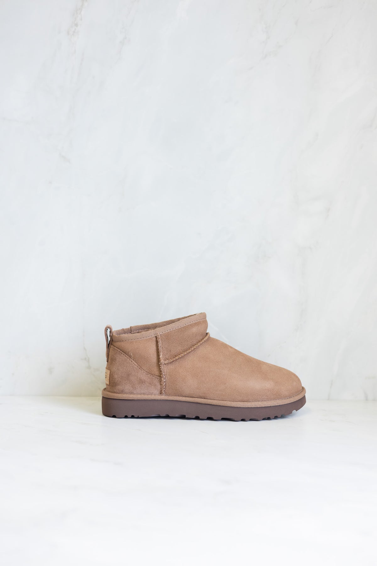 W Classic Ultra Mini fra Ugg. En av UGG sine bestselgere med lavt skaft for enkelt å kunne ta de av og på. Dette er en ikonisk modell med fleksibel og lett såle som gjør disse svært gode å gå i, og med et deilig ullfôr på innsiden.