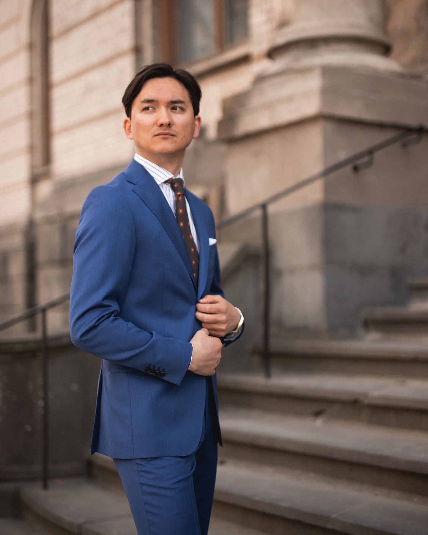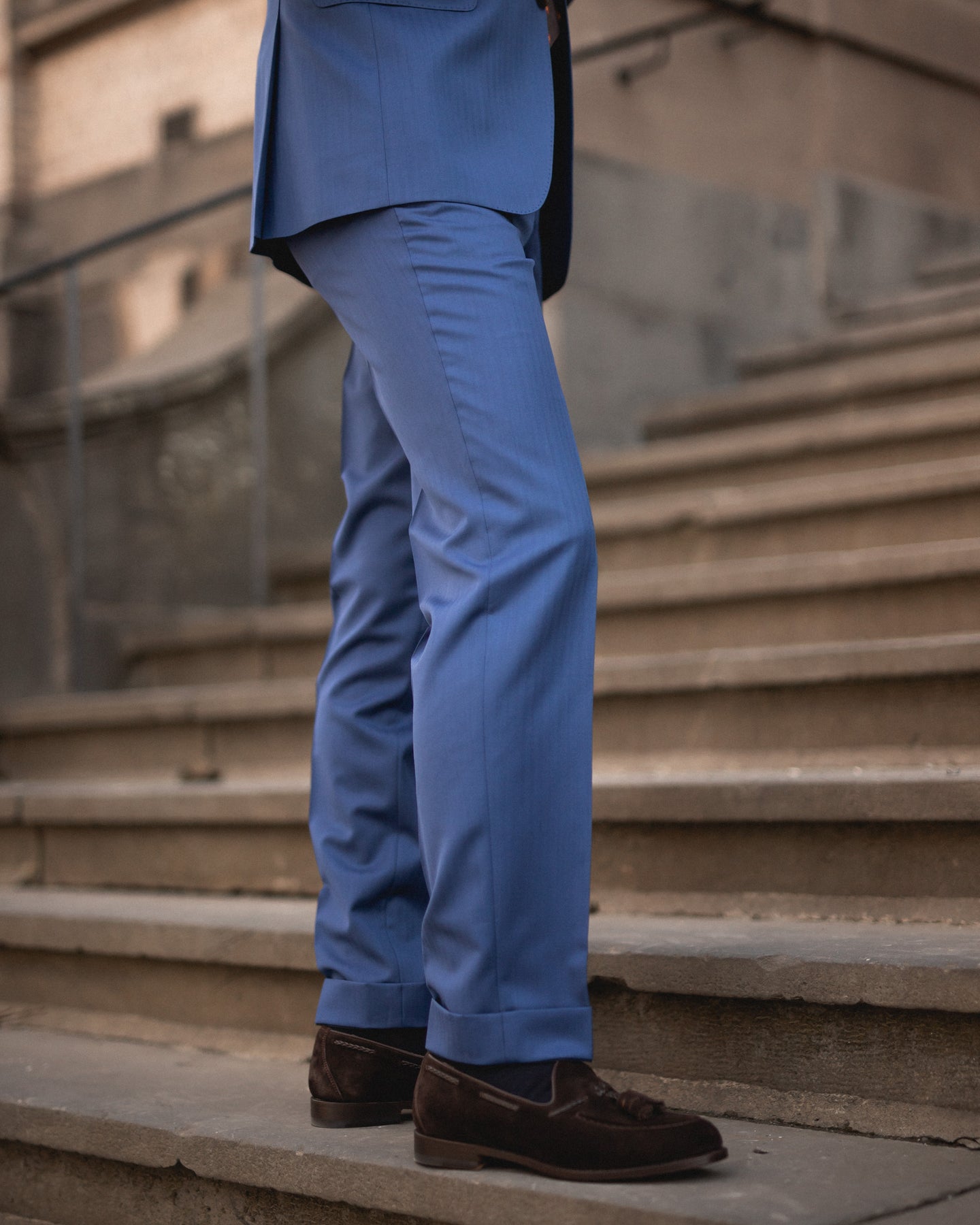 En elegant og klassisk dress fra Frislid med subtilt mønster. Den enkeltspente modellen har smal passform og et naturlig fall. Et tidløst og stilfullt valg, perfekt som et alternativ til den tradisjonelle blådressen.