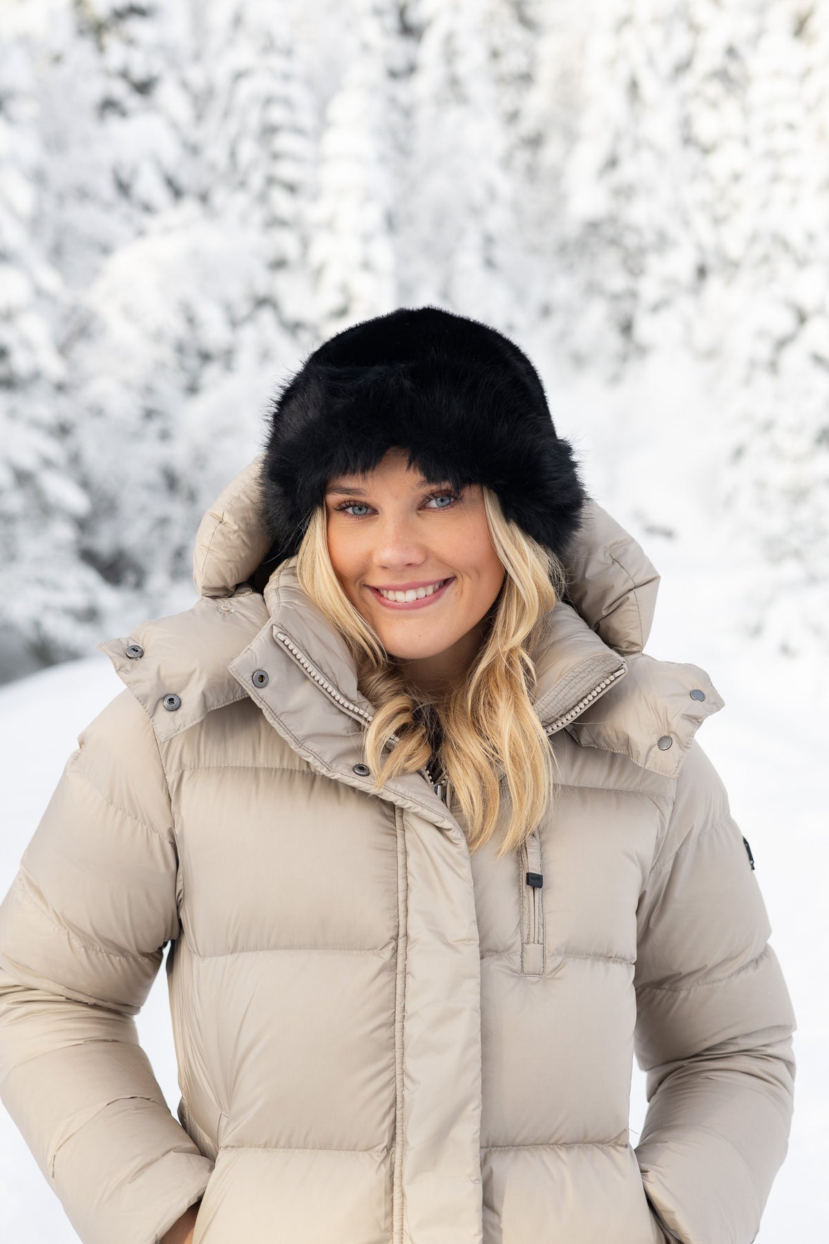 Noma sine eksklusive hatter i fuskepels, modell Sonja. Hatten har en mer fluffy kant nederst. Onesize, ca 60cm i diameter.
