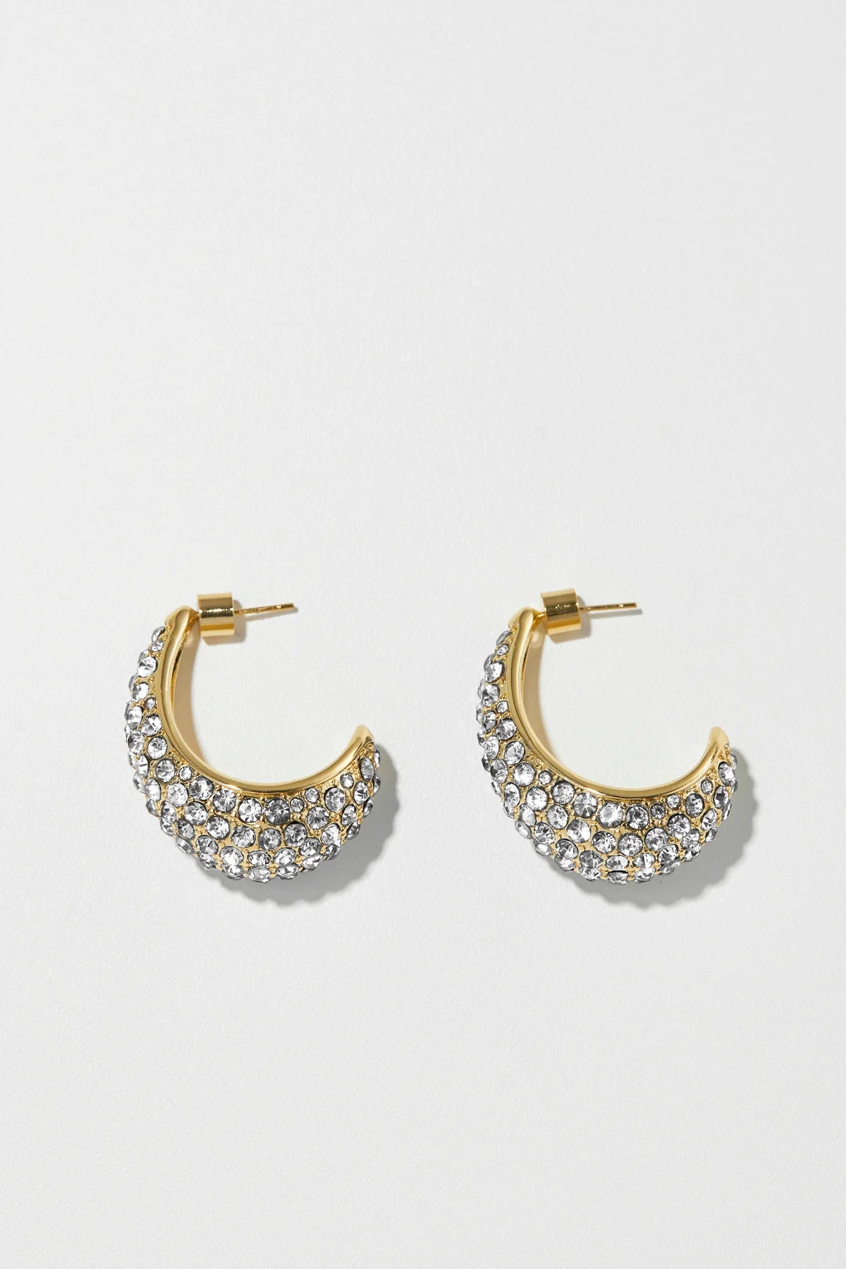 Disse øredobbene har en flatterende buet form og er besatt med mange glitrende krystaller som fanger lyset på en vakker måte.