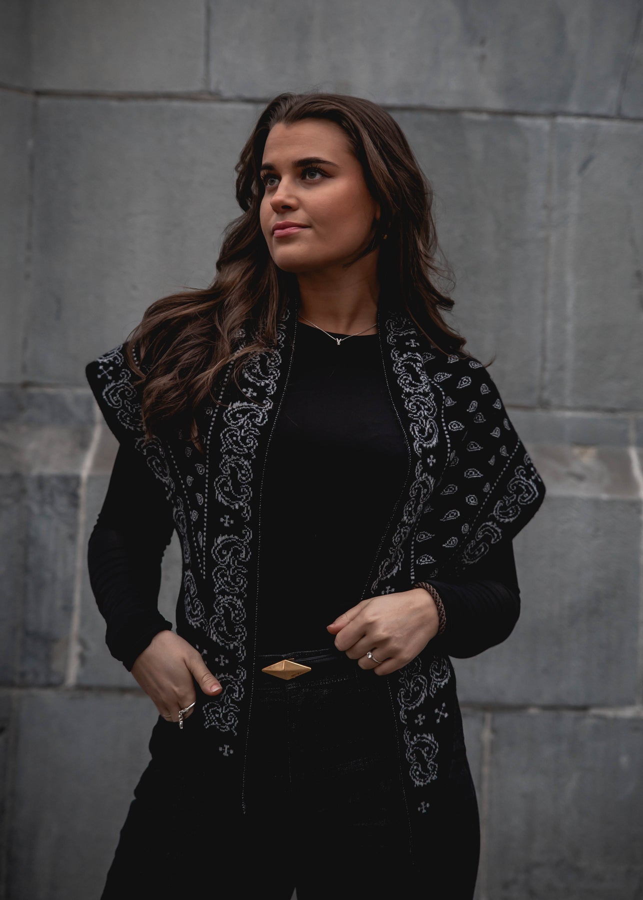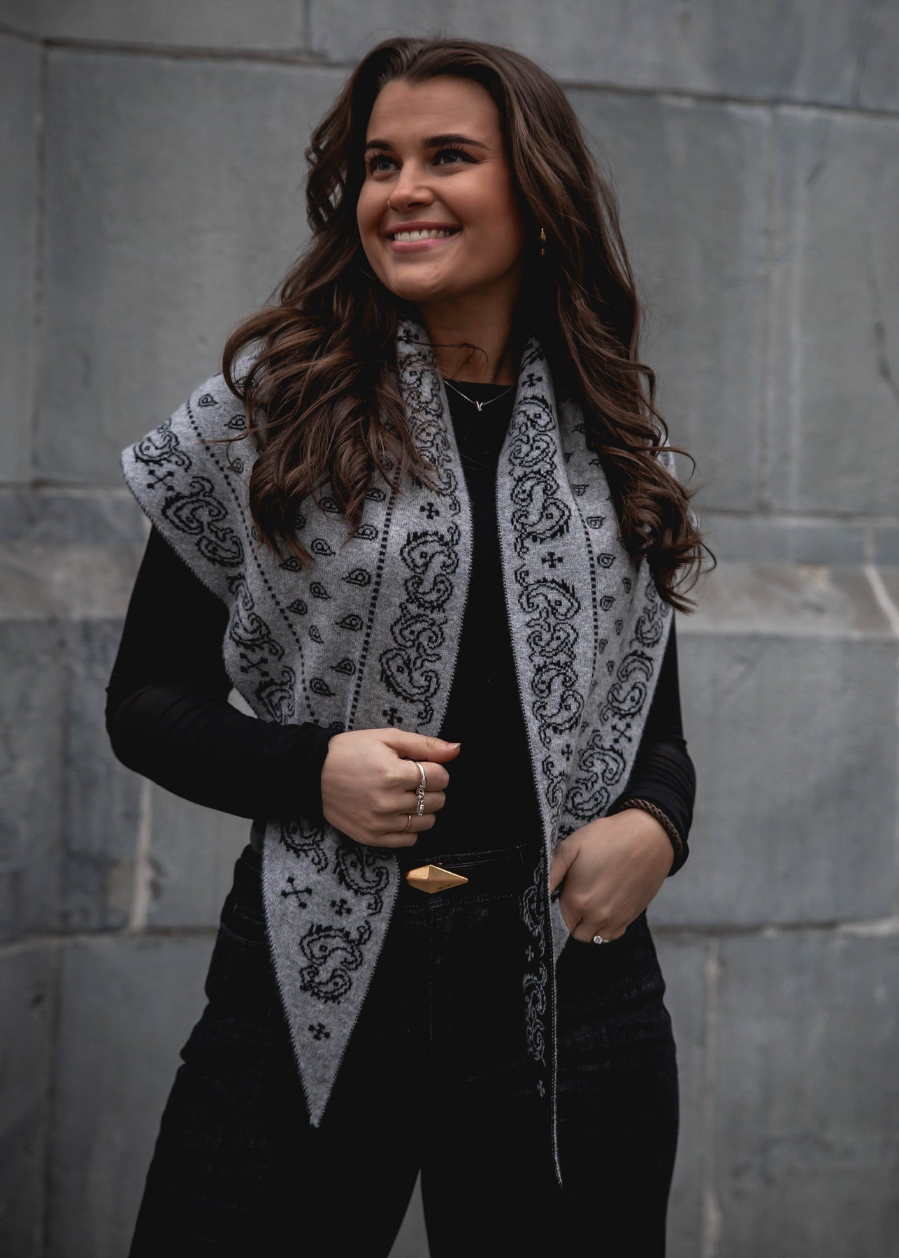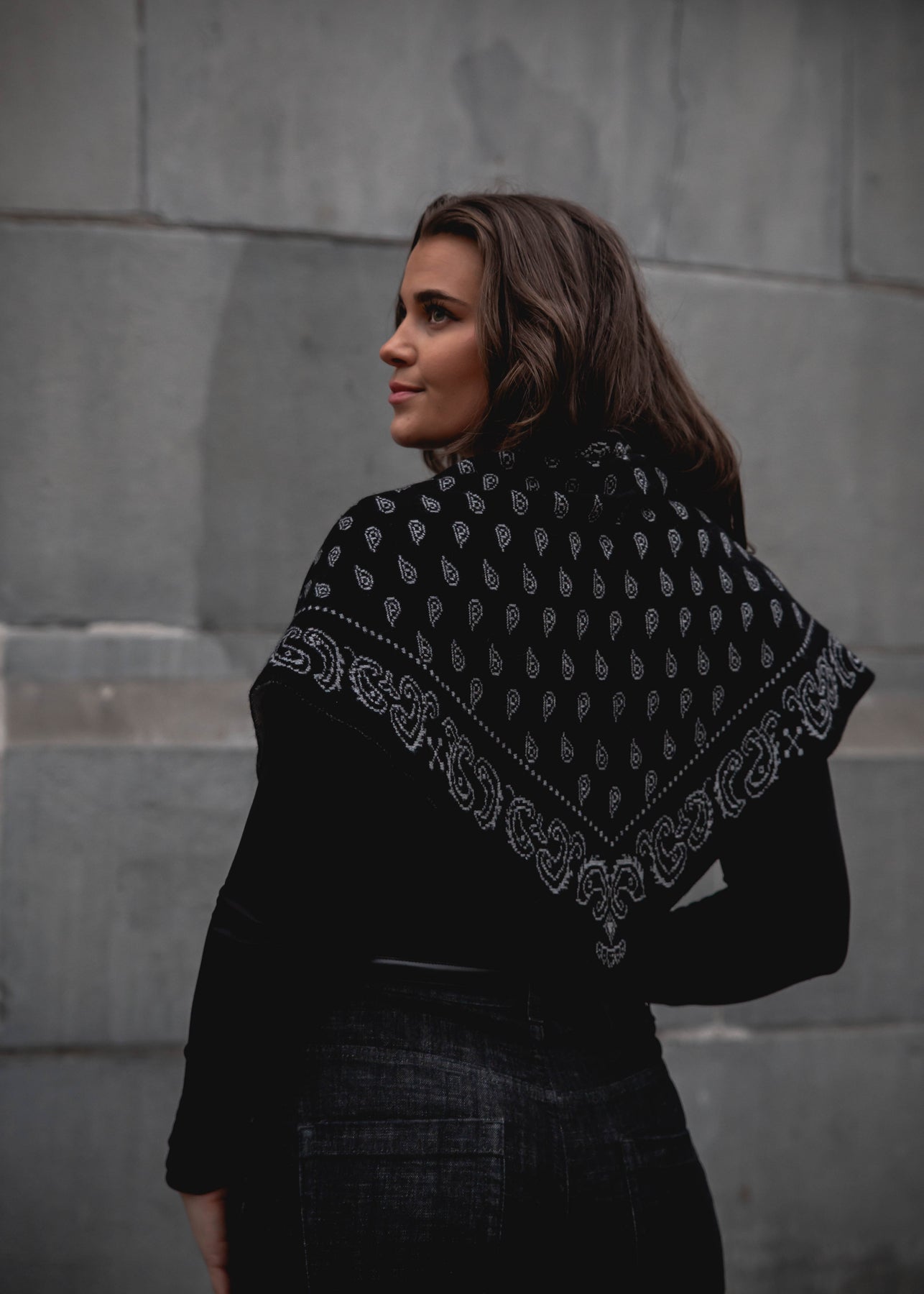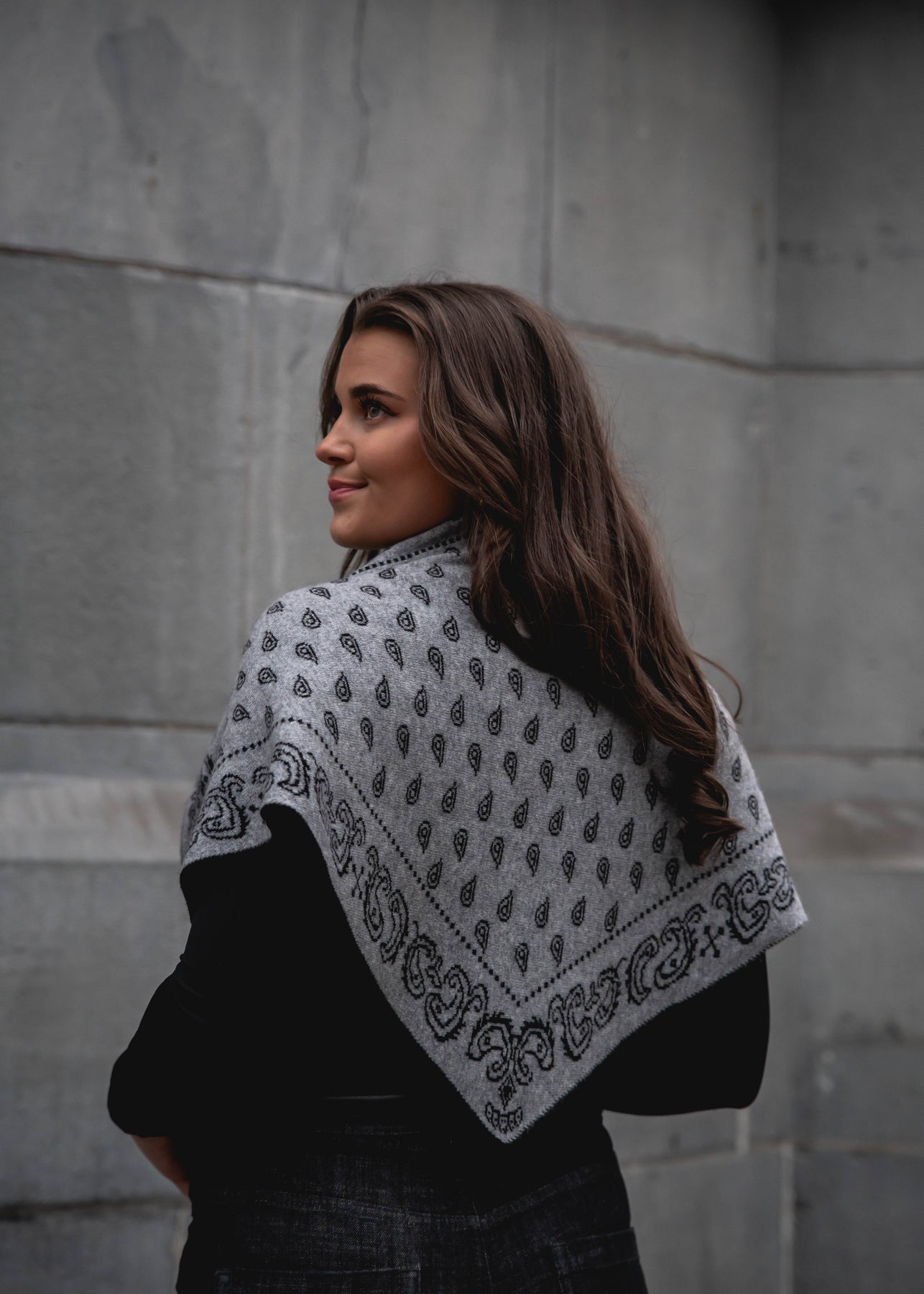 Sesongens hotteste tilbehør! Dette eksklusive skjerfet fra Guest in Residence er en moderne tolkning av den klassiske bandanaen, designet for deg som verdsetter både luksus og tidløs stil. Skjerfet er laget i deilig, myk, 100% kashmir. Skjerfet er tosidig, med sort og grått på den ene siden, og grått og sort på den andre siden. Perfekt å style til skjorter, strikk eller utenpå kåpen.