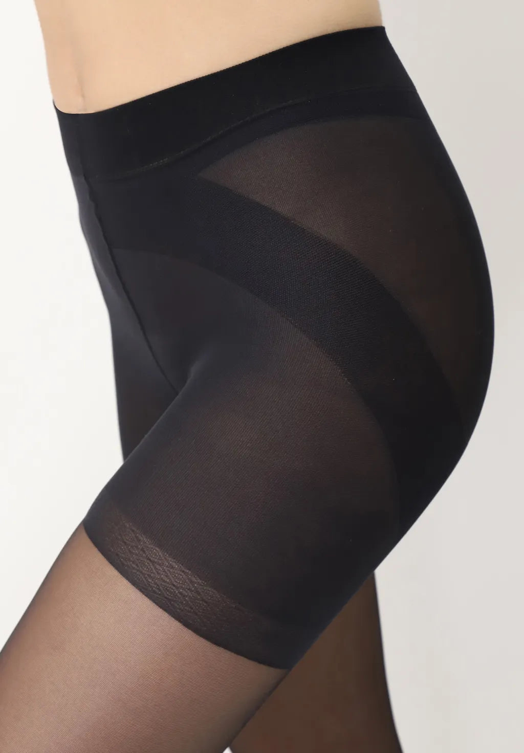 Støttende og transparente strømpebukser på 20 denier, med gjennomsiktige ben og en lett ugjennomsiktig effekt. Trusedelen er push-up og løfter baken for en flott silhuett. Kompresjonsbånd rundt mage og hofter fullfører formingen, og gir en harmonisk og tonet figur. Sømmen er flat for å unngå ubehag og forbli usynlig under klær, mens kilepartiet i hygienisk bomull gjør det mulig å bruke strømpebuksene uten undertøy.