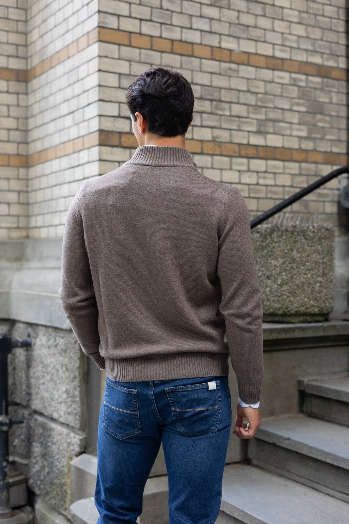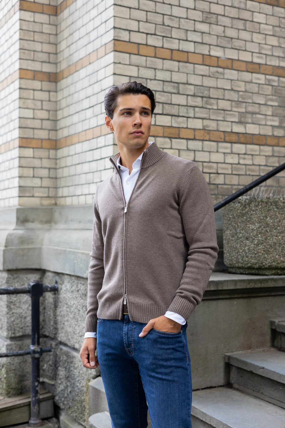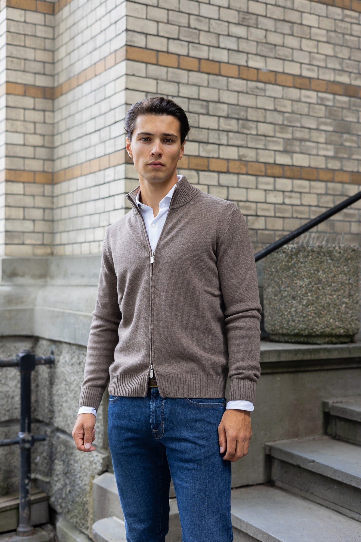 Cardiganen har ribbestrikkede kanter på ermene og nederst på plagget, noe som gir en elegant passform og bidrar til å holde på varmen. Den fine blandingen av ull og cashmere sikrer at genseren ikke bare er varm, men også pustende, noe som gjør den komfortabel å bruke hele dagen. Cardiganen har stående krage med to-veis glidelås i front, og har en normal passform.