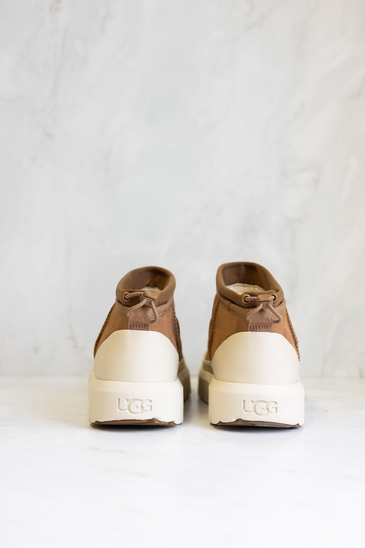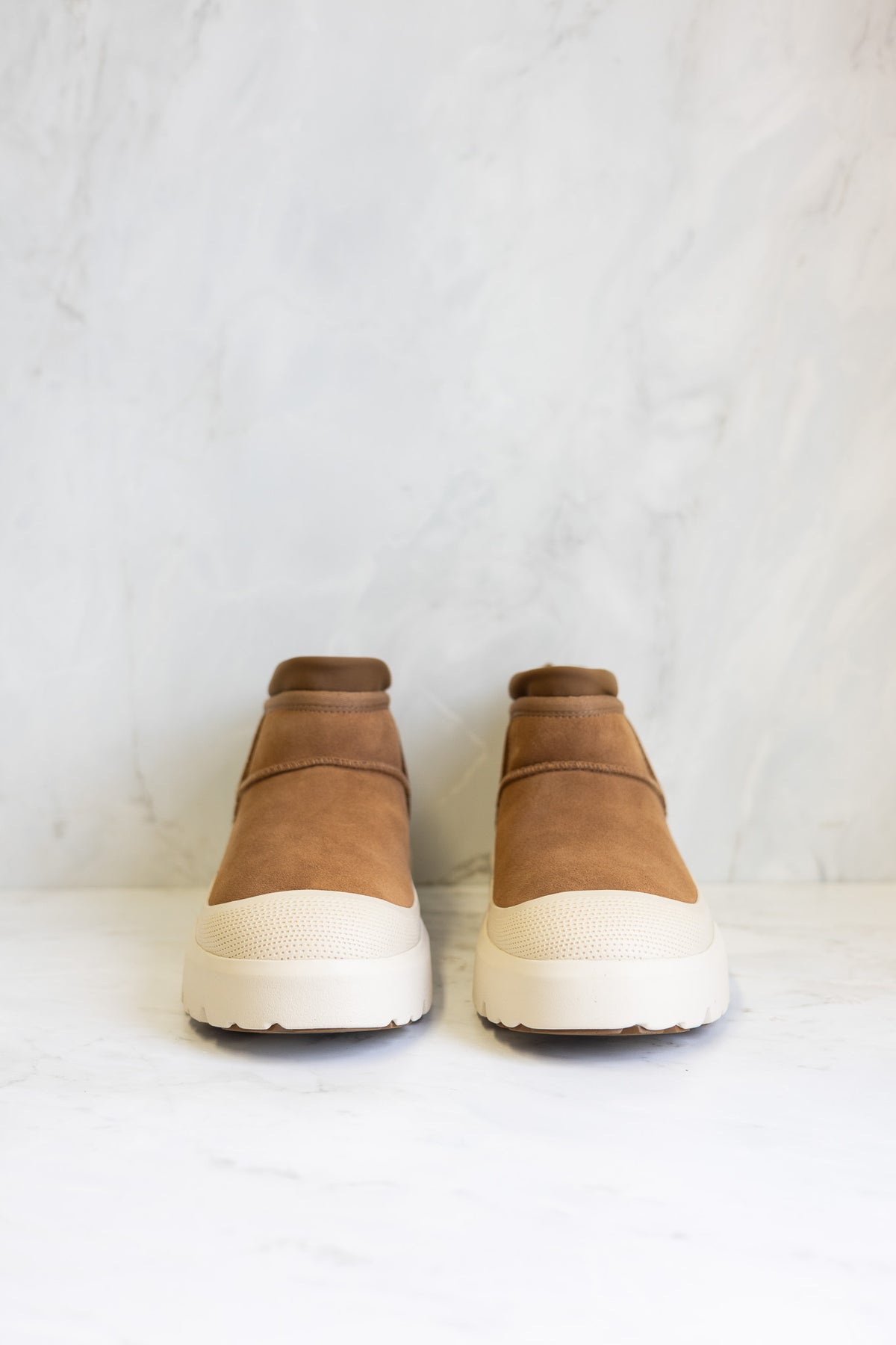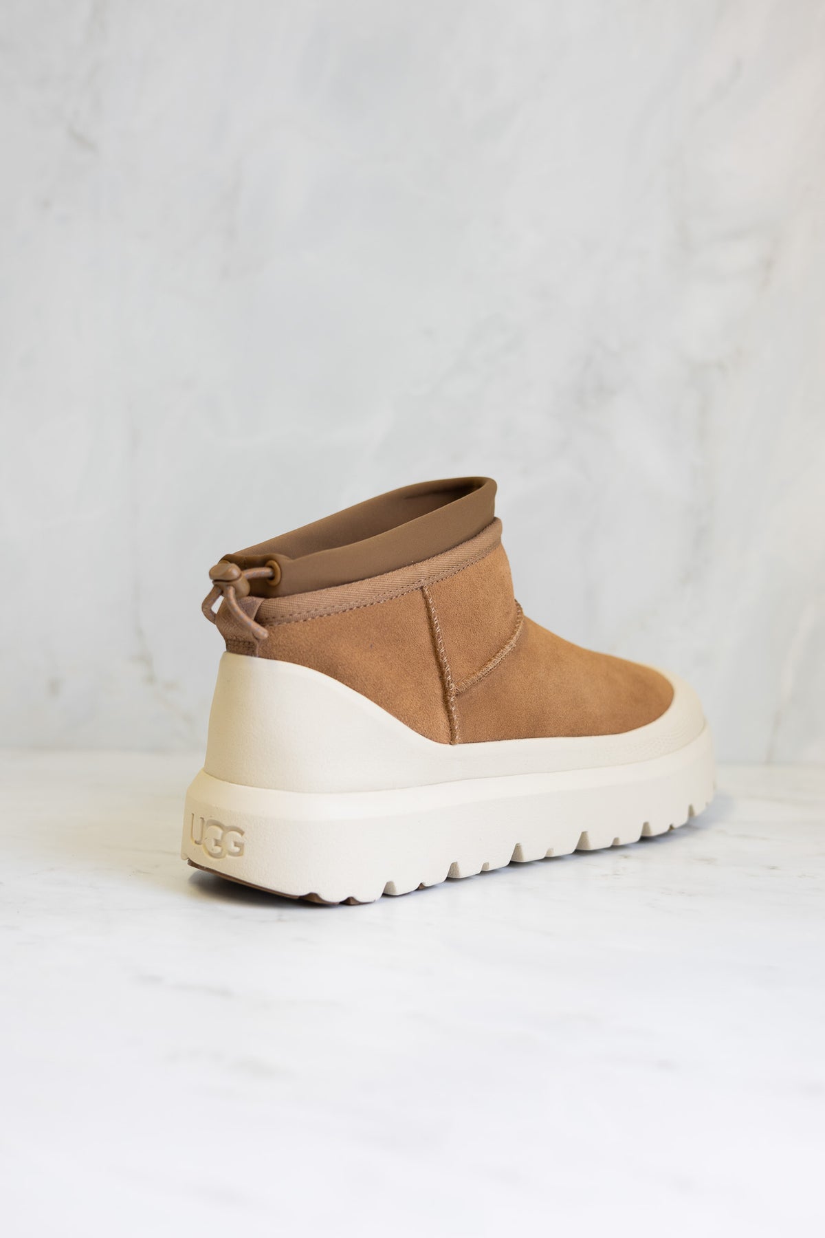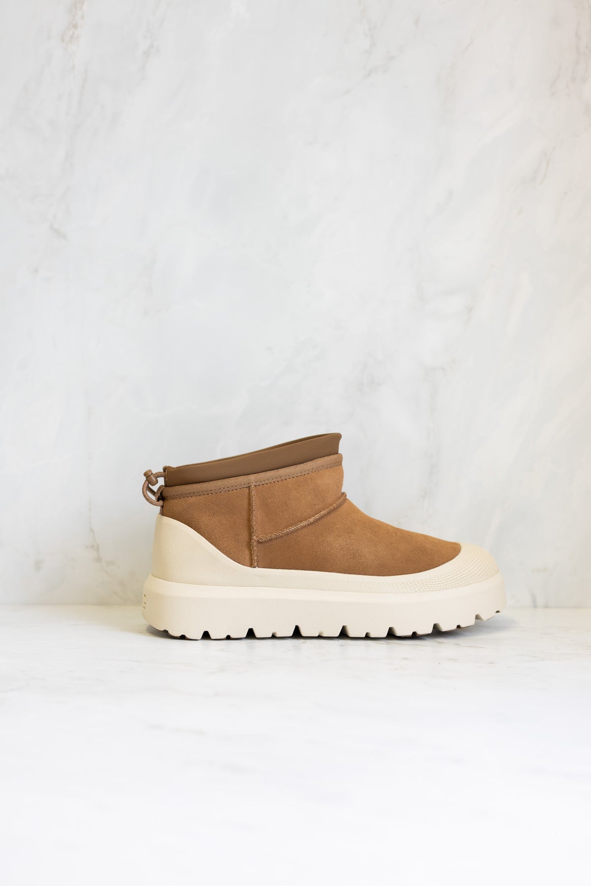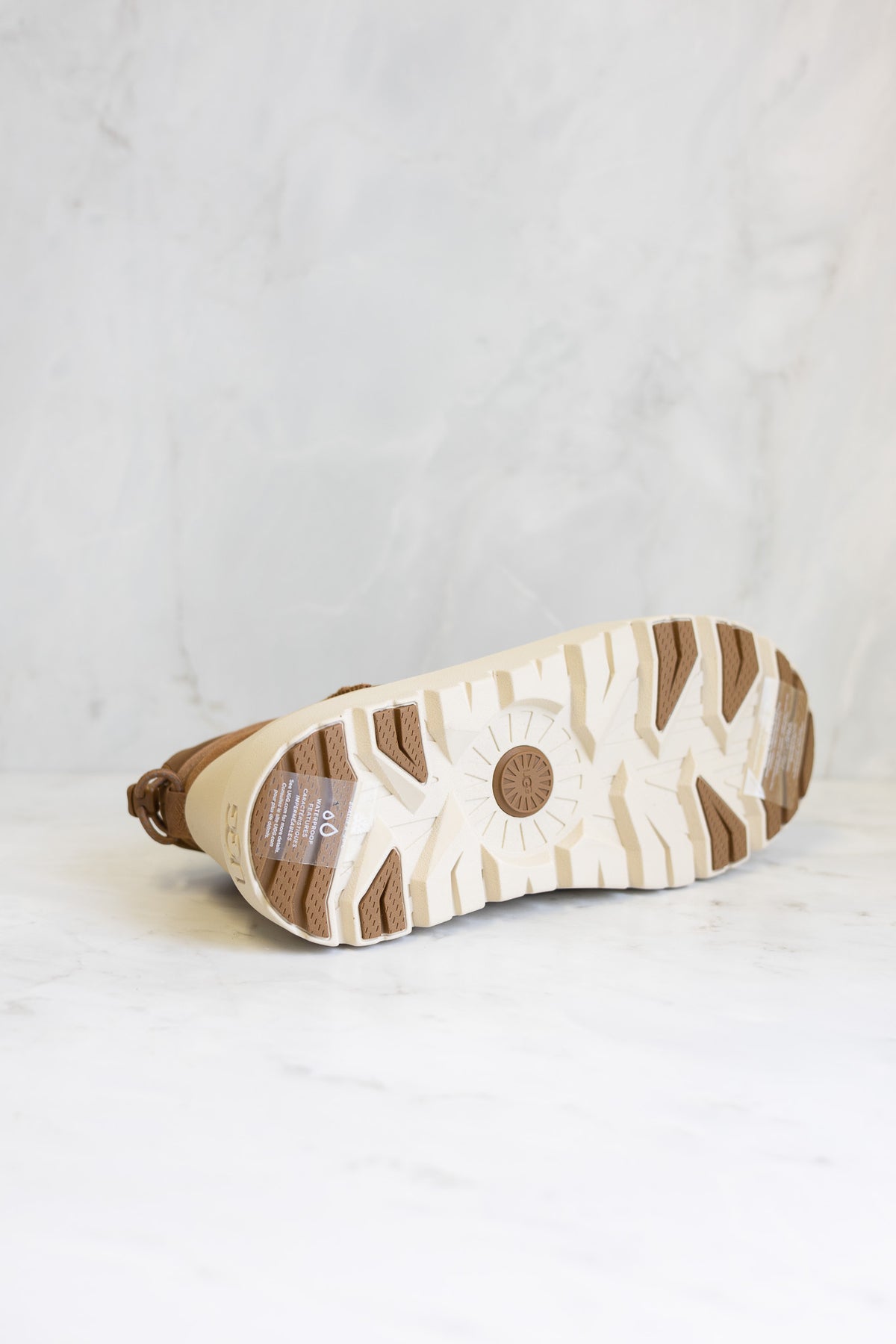En kort, værbestandig versjon av den klassiske UGG-støvelen med moderne oppdateringer. Laget i vanntett semsket skinn med sømtette konstruksjon og elastisk snøring med toggles som holder ute slaps og snø. UGGplush™-fôr og dempende innersåle gir myk, varm komfort, mens den lette Sugarcane EVA-sålen med Spider Rubber®-pupper sørger for godt grep selv på glatte underlag. Frostsikker ned til −20 °C — perfekt for kalde og våte dager.
