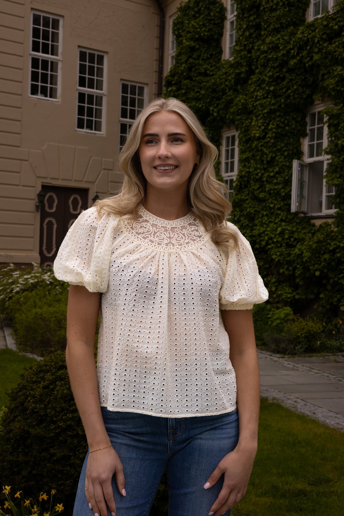 Amina top fra Ulla Johnson. Denne nydelige toppen fra merket bemerker seg med sine mange unike detaljer. Toppen har en liten puffers, rett og avslappet fasong, blondedetaljer kombinert med en meshblonde i halsen for det lille ekstra. Knappelukking bak i nakken.