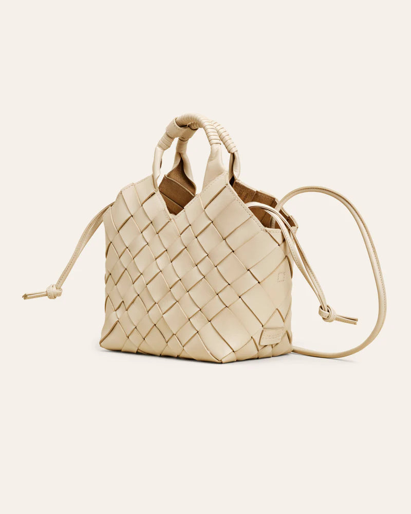 Country of origin: IN / Material composition: 100% Leather / Inner lining: 100% Cotton / Dimensions: 25 x 22 x 15 cm / Handle drop: 13 cm / Shoulder strap drop: 47,5 cm / Adjustable shoulderstrap: Yes / Dust bag yes/no: Yes / Product description: Features: Shoulder strap. Removable inner bag with zip pocket. Credit card pocket. Magnet closure. Wear it on the shoulder, cross-body or held in the top handle. Comes with dust bag.100% Hand woven cowhide | Handmade in India / Material: Cowhide / Family: tote
