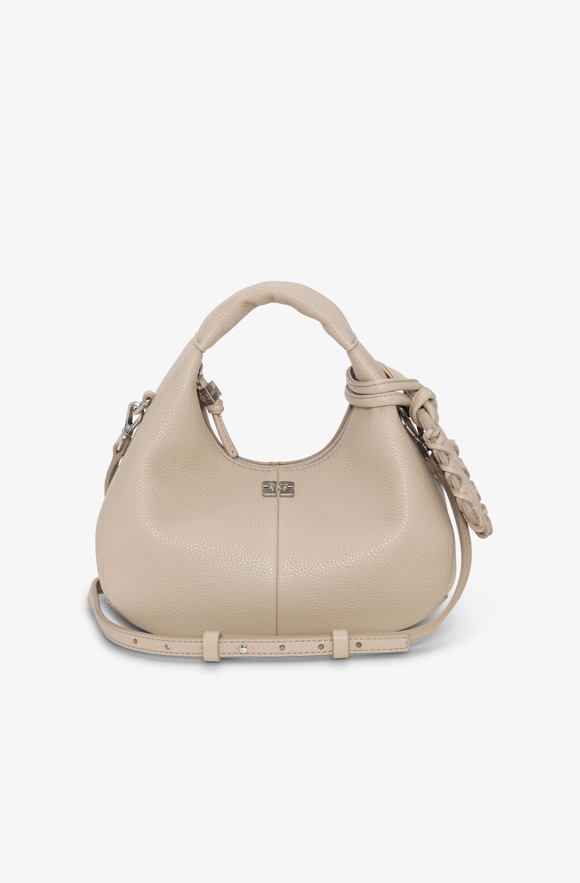 Hobo Mini Grained fra Ganni. Denne vesken har topphåndtak, justerbar og avtakbar stropp og glidelåslukking. Vesken har en merkelapp med speil og en innvendig lomme. Perfekt til hverdagsbruk og til finere anledninger.