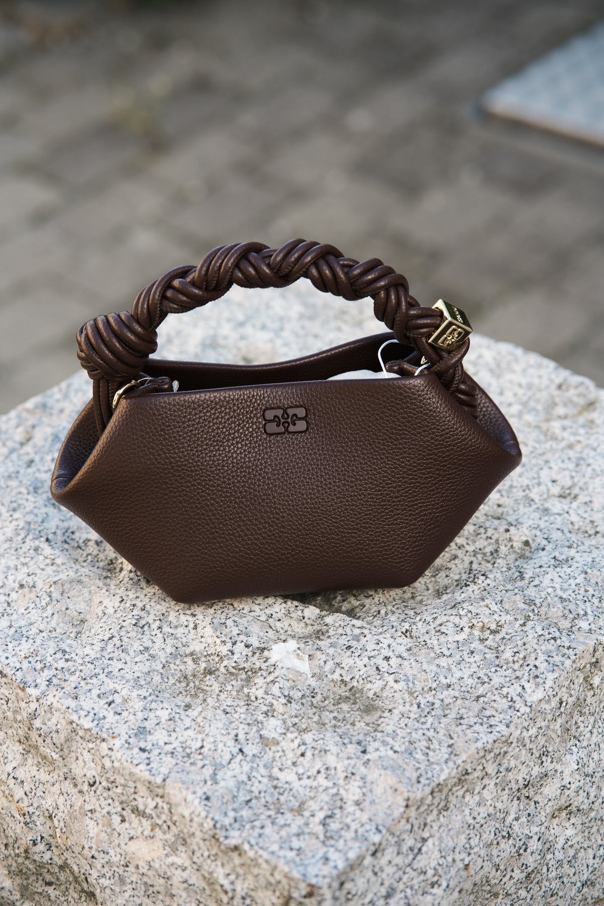 Bou Bag Mini Grained fra Ganni. Denne vesken har en metallisk Ganni Butterfly-logo i samme fargetone, et vridd håndtak med en flettet knute og en gullfarget metallisk terning. Vesken har en innvendig magnetisk lukking, en flat kortlomme på innsiden og en justerbar og avtakbar skulderstropp. Perfekt til formelle og uformelle anledninger.