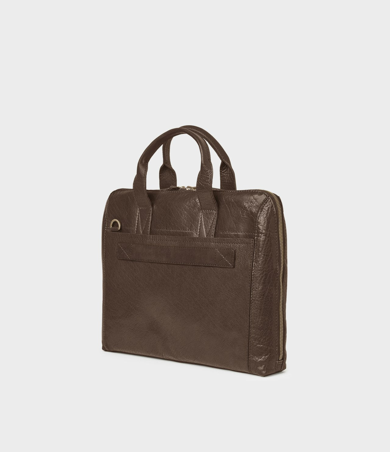 En raffinert og tidløs PC-veske i mørkebrunt bøffelskinn, designet for deg som ønsker stil og funksjon i ett. Vesken rommer plass til en laptop opptil 15″ og tilbyr flere innvendige lommer for effektiv organisering. På forsiden finnes en praktisk lomme med magnetlukking, og på baksiden sitter en stropp for å feste vesken til en trillebag. Vesken leveres med avtagbar og justerbar skulderstropp i tekstil med skinndetaljer, noe som gir fleksibel bæring både som skulderveske og håndveske. Materialet er fullnarvet bøffelskinn med naturlig overflate som eldes med karakter.