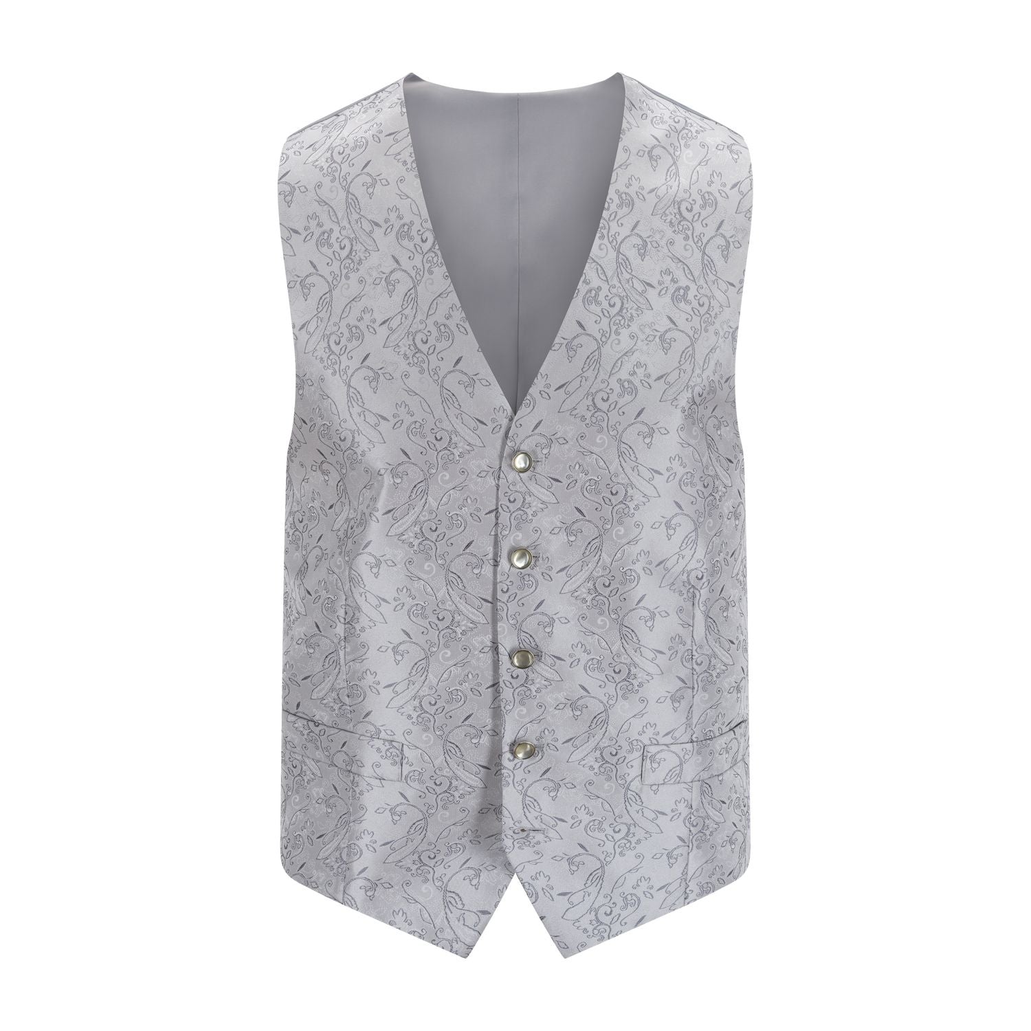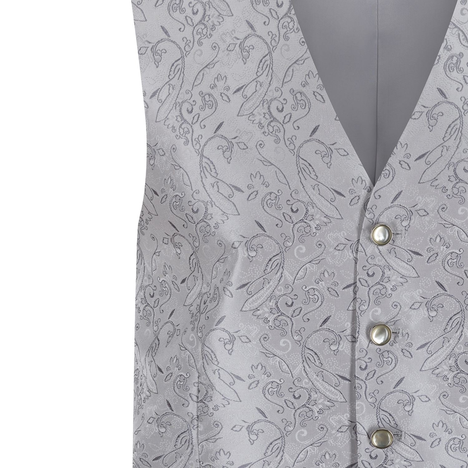 En elegant sølv brokadevest fra Frislid, designet for formelle anledninger. Den har et subtilt mønster som gir et raffinert og luksuriøst uttrykk, og passer perfekt sammen med kjole og hvitt.