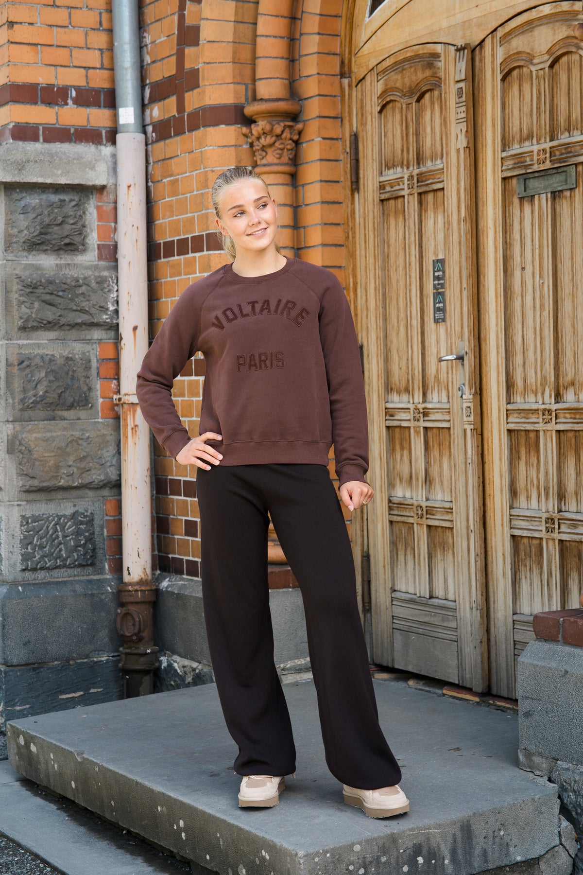 Upper Mo Voltaire Paris fra Zadig & Voltaire. Myk sweatshirt med klassisk rund hals og avslappet passform. Upper Mo har buet "Voltaire Paris"-logo brodert på brystet, og nedtonet look som matcher alt fra skinnbukser til denim. Ribbestrikkede kanter gir en sporty touch, mens innsiden er myk mot huden, perfekt for både hverdag og reise.