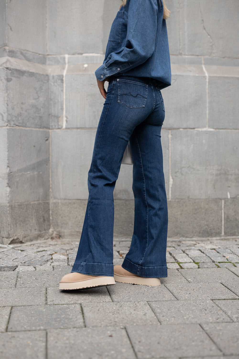 Den populære Modern Dojo jeansen fra 7 For All Mankind får du nå i en mørkblå denim, og er perfekt til høsten. Buksene er komfortable på, høy midje og utsvingte ben. Perfekt å style til hverdags.