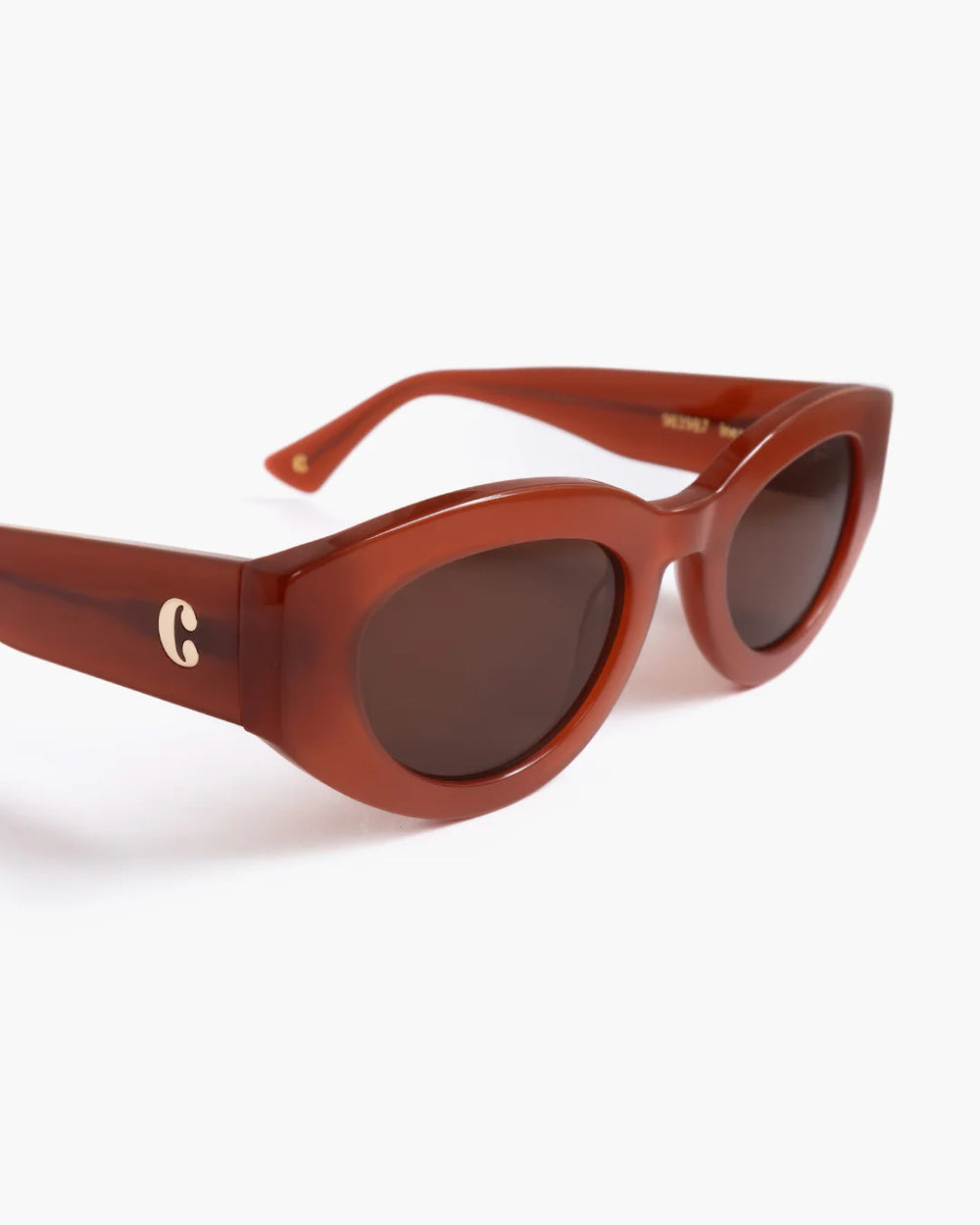 Ines er en moderne cateye modell, med en robust ramme og rund silhuett. Solbrillene er i en varm, mørk brunfarge. Laget i bioacetat.