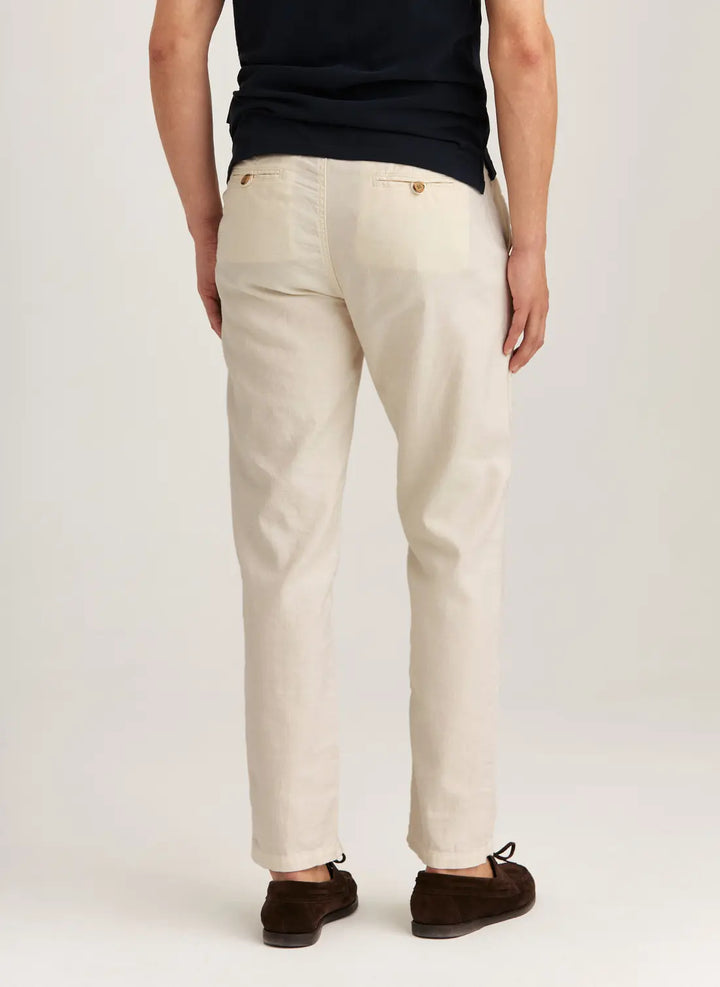 Fenix Linen Trousers fra Morris er laget i en deilig blanding av bomull og lin som passer perfekt både til hverdags og finere anledninger og varme dager. Buksen har en lett avsmalnet fasong, med elastisk linning og snøring for optimal komfort.