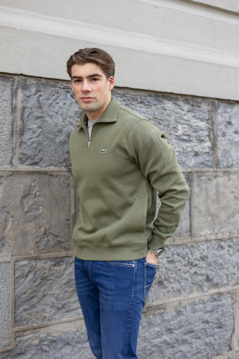 Genser fra Lacoste. En avslappet genser med den ikoniske logoen på venstre bryst, half-zip med høy krage og en normal passform. Genseren kan brukes til hverdag sammen med en jeans, eller til avslappede anledninger.