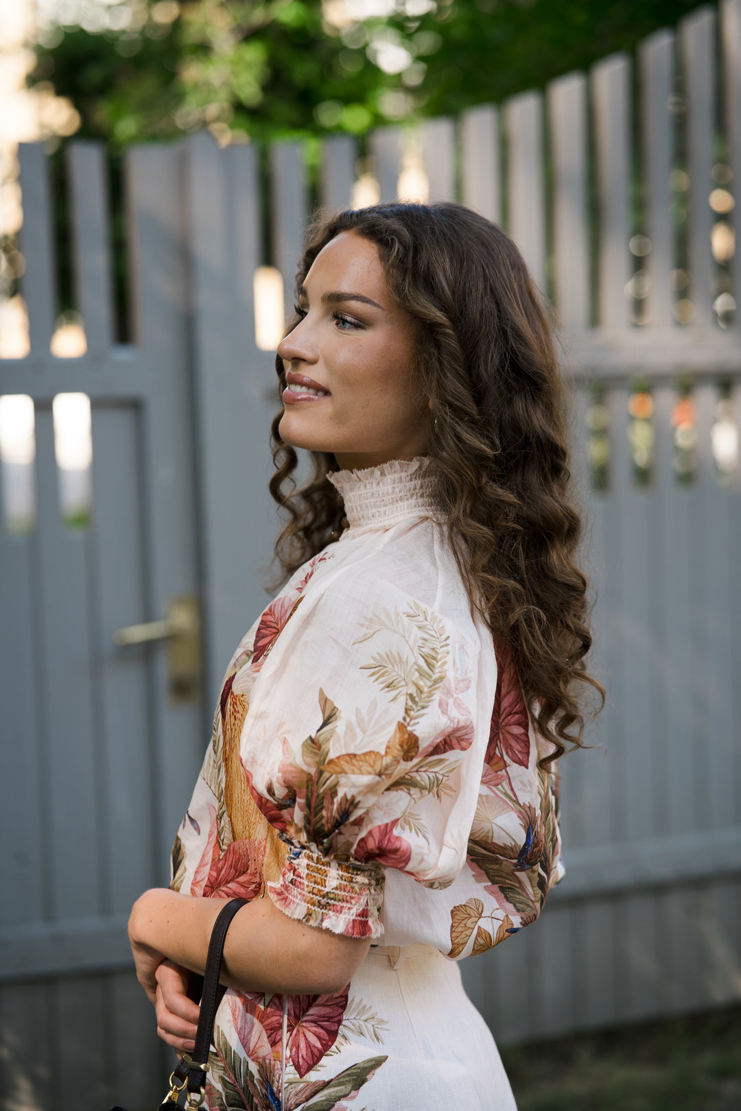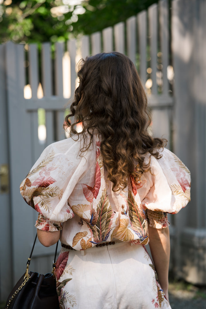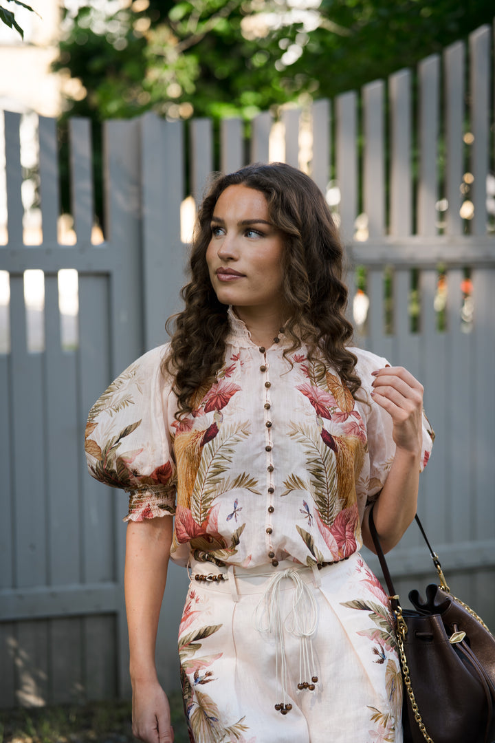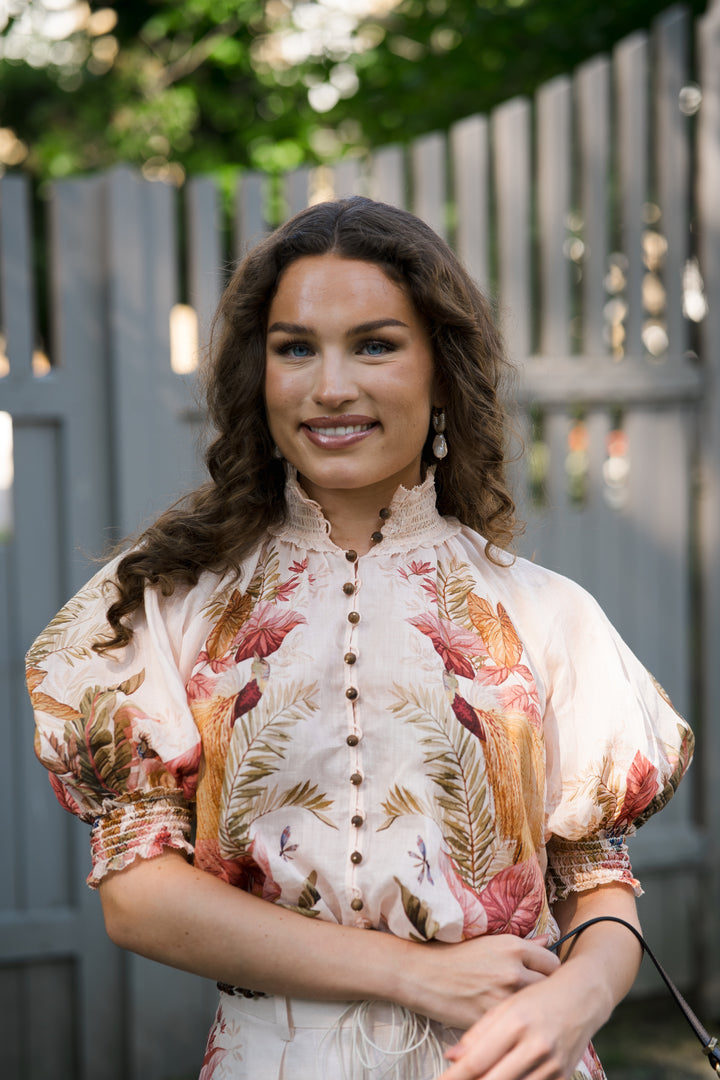 En nydelig bluse med korte, voluminøse ermer, knapper i front og en lekker krage. Den har et elegant mønster i nydelige farger og lekre detaljer. Style gjerne blusen sammen med tilhørende skjørt.