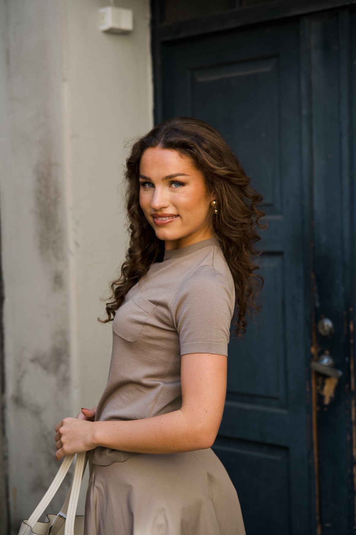 Egidio fra Max Mara er en nydelig t-skjorte laget i 100% ull, med rund hals, korte ermer og en normal passform. Den har en liten lomme på venstre bryst, og ribbestrikkede kanter. Style den sammen med bukse og skjørt.