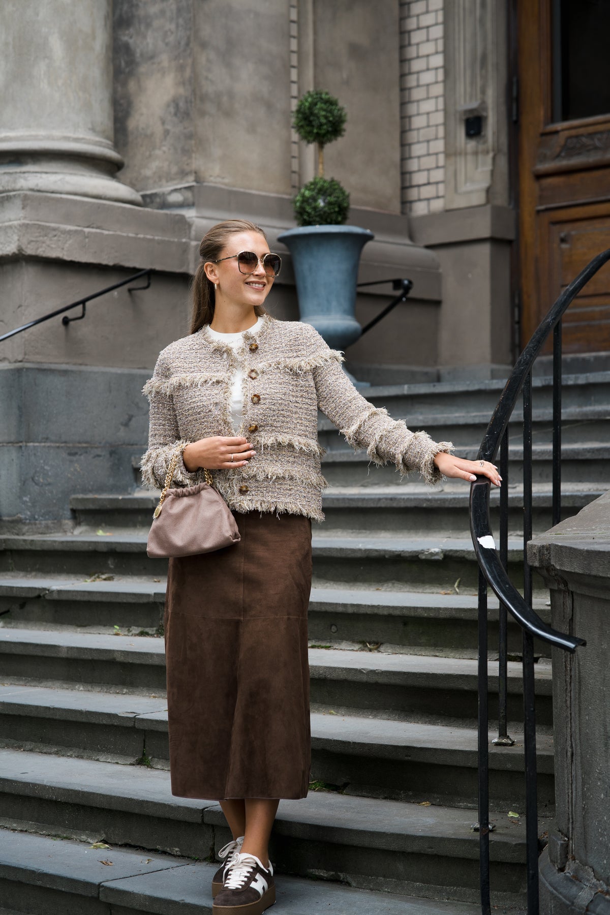 Philipa Goat Suede Skirt fra Arma. Et tidløst skjørt i semsket skinn med A-fasong, som er laget av 100% geiteskinn. Dette skjørtet har en flatterende silhuett med midilengde, og en liten splitt midt bak. Perfekt å style til hverdagsbruk og til mer formelle anledninger.