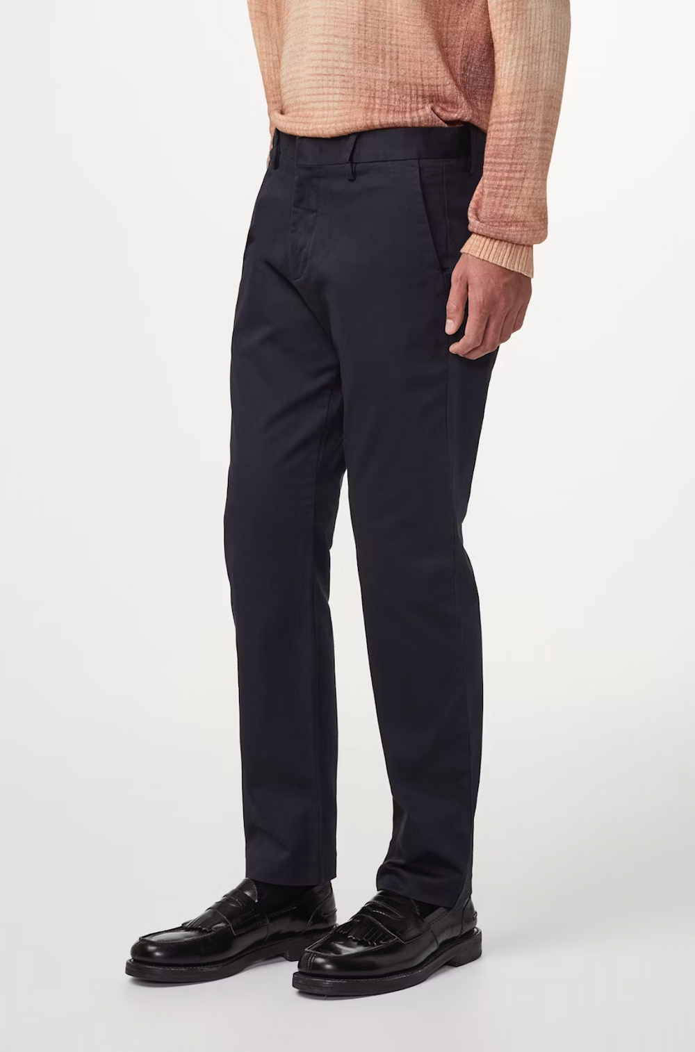 Theo is a chino at heart but with the formal elements of a dress pant. Crafted in a BCI sourced brushed cotton from Italian mill Progetto Uno. This versatile mid-rise trouser has a tapered fit. Finished with a crisp crease at leg and blind hem m99% Organic cotton 1% Elastane