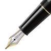Meisterstück Classique Gold Coated Fountain Pen er et ekte designikon fra Montblanc. Hetten og skaftet er laget i svart edelharpiks, og den karakteristiske hvite Montblanc-stjernen pryder toppen. Tre gullbelagte ringer med inngravert Montblanc-logo og en gullbelagt klips med pennens unike serienummer understreker det tidløse designet. Fyllepennen har en stempelkonverter som gjør det mulig å bruke blekkpatroner, og den håndlagde splitten i Au585/14K gull med rhodiumbelagt innlegg gir en jevn og presis skriveopplevelse.